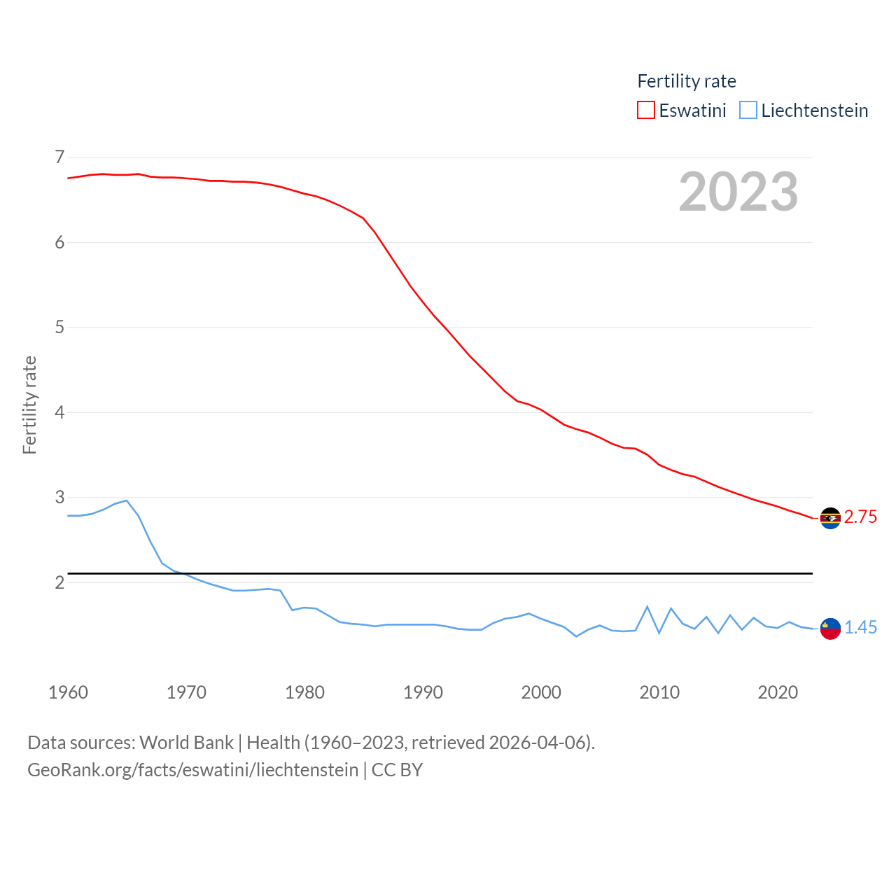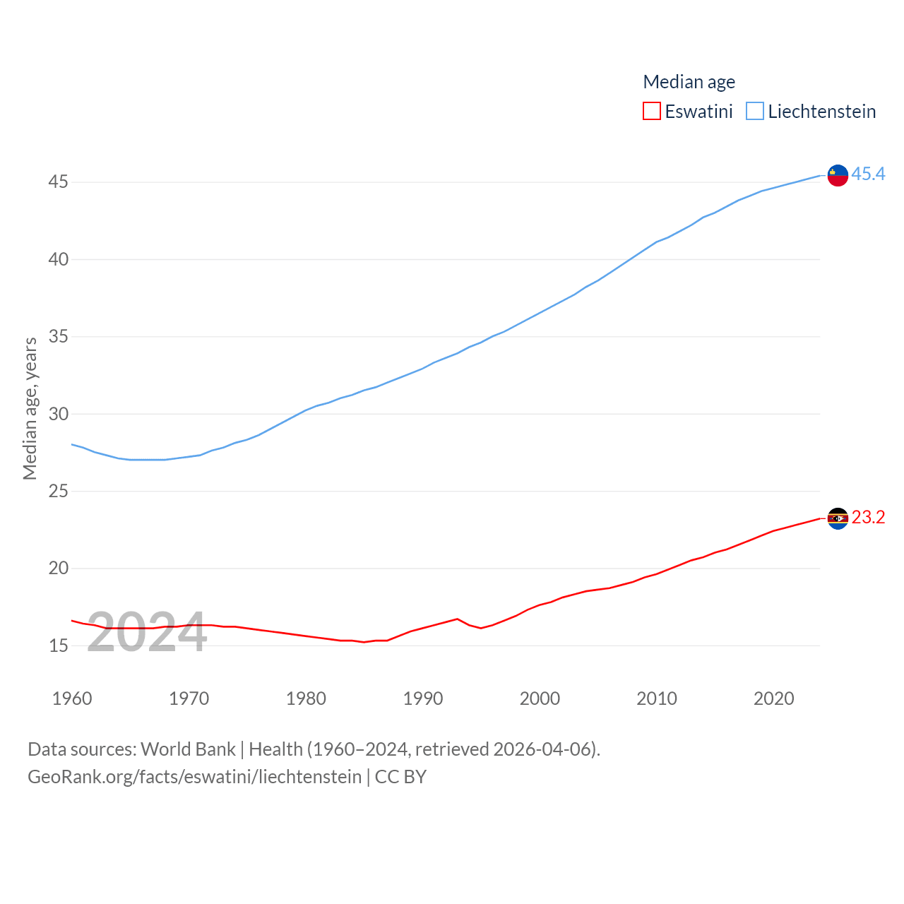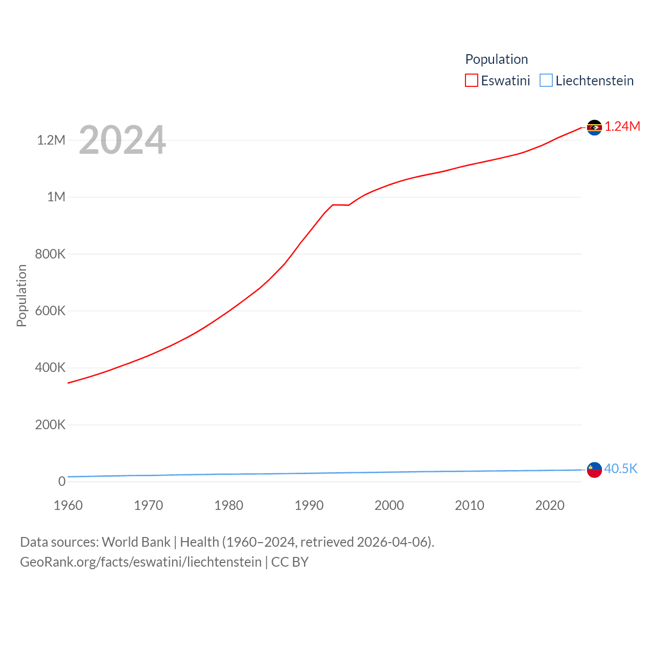 Eswatini has a population of 1.24M (ranked 157/197), compared with 40.4K in Liechtenstein (ranked 190/197). Eswatini's land area is 6,641 sq mi versus 61.8 sq mi for Liechtenstein (ranked 154th vs. 192nd).