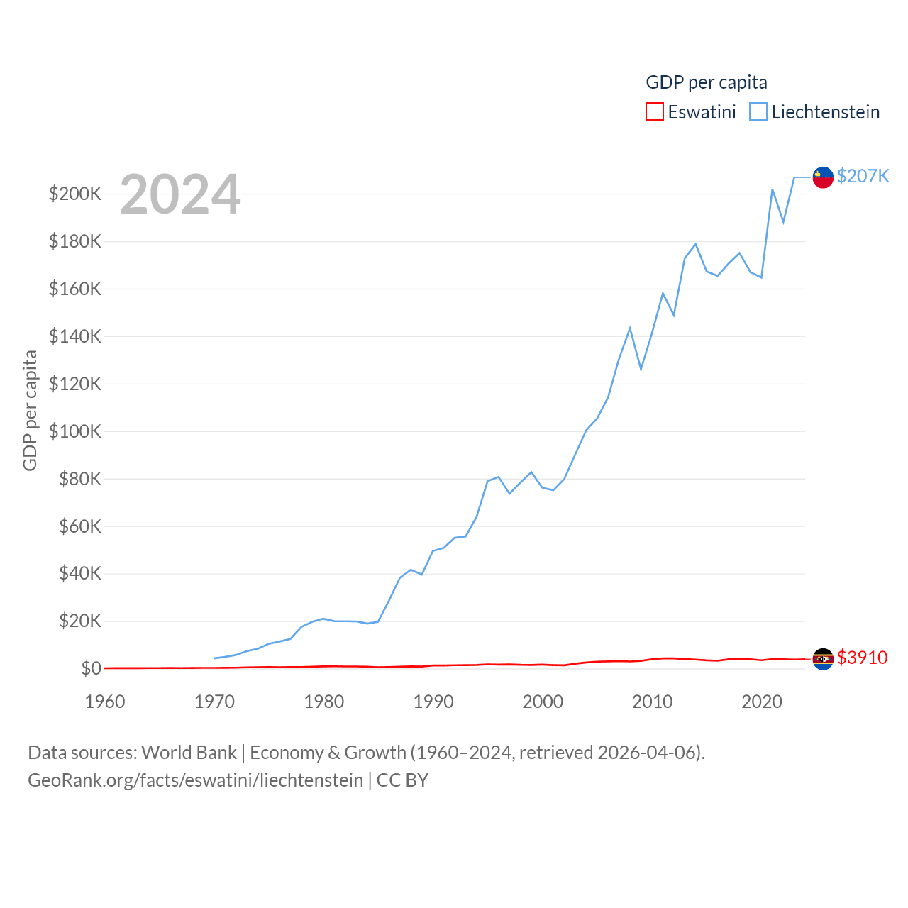 By GDP, Eswatini ranks 162/197 ($4.86B) and Liechtenstein ranks 156/197 ($8.24B). By GDP per capita, Eswatini ranks 131/197 ($3,910), while Liechtenstein ranks 2/197 ($206,781).