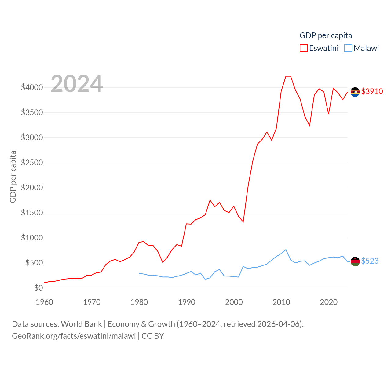 By GDP, Eswatini ranks 162/197 ($4.86B) and Malawi ranks 151/197 ($11.3B). By GDP per capita, Eswatini ranks 131/197 ($3,910), while Malawi ranks 194/197 ($523).