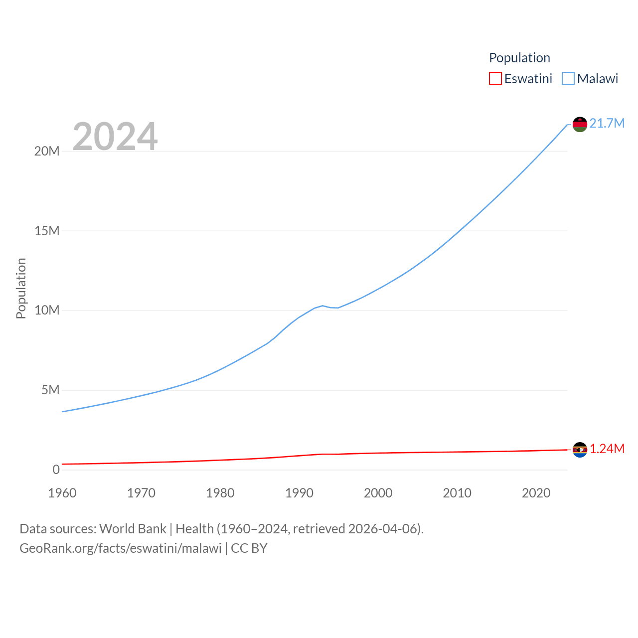 Eswatini has a population of 1.24M (ranked 157/197), compared with 21.7M in Malawi (ranked 62/197). Eswatini's land area is 6,641 sq mi versus 36,402 sq mi for Malawi (ranked 154th vs. 107th).