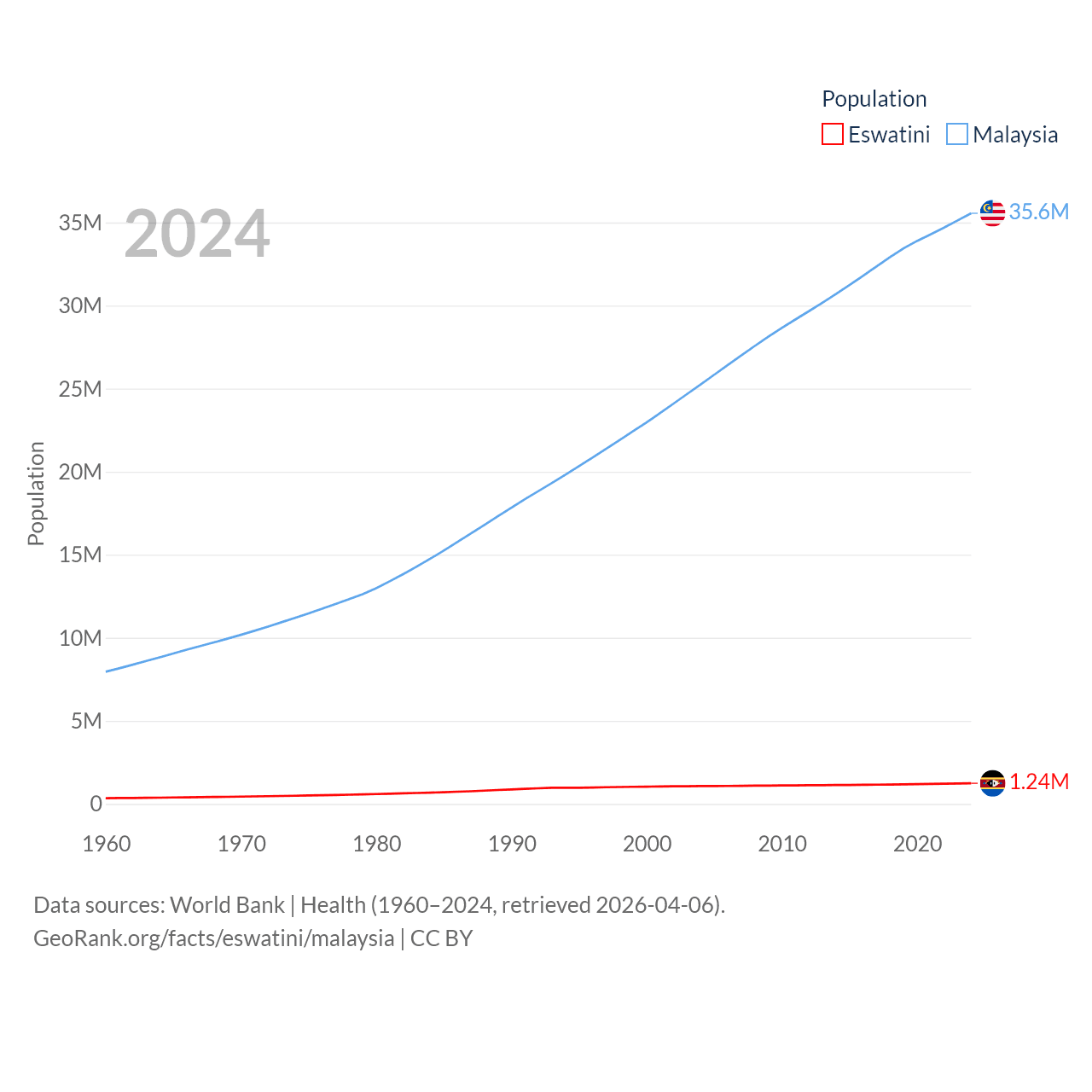 Eswatini has a population of 1.24M (ranked 157/197), compared with 35.6M in Malaysia (ranked 44/197). Eswatini's land area is 6,641 sq mi versus 126,854 sq mi for Malaysia (ranked 154th vs. 65th).
