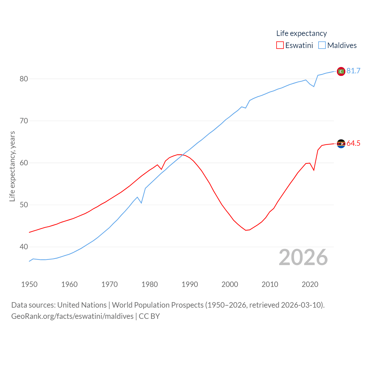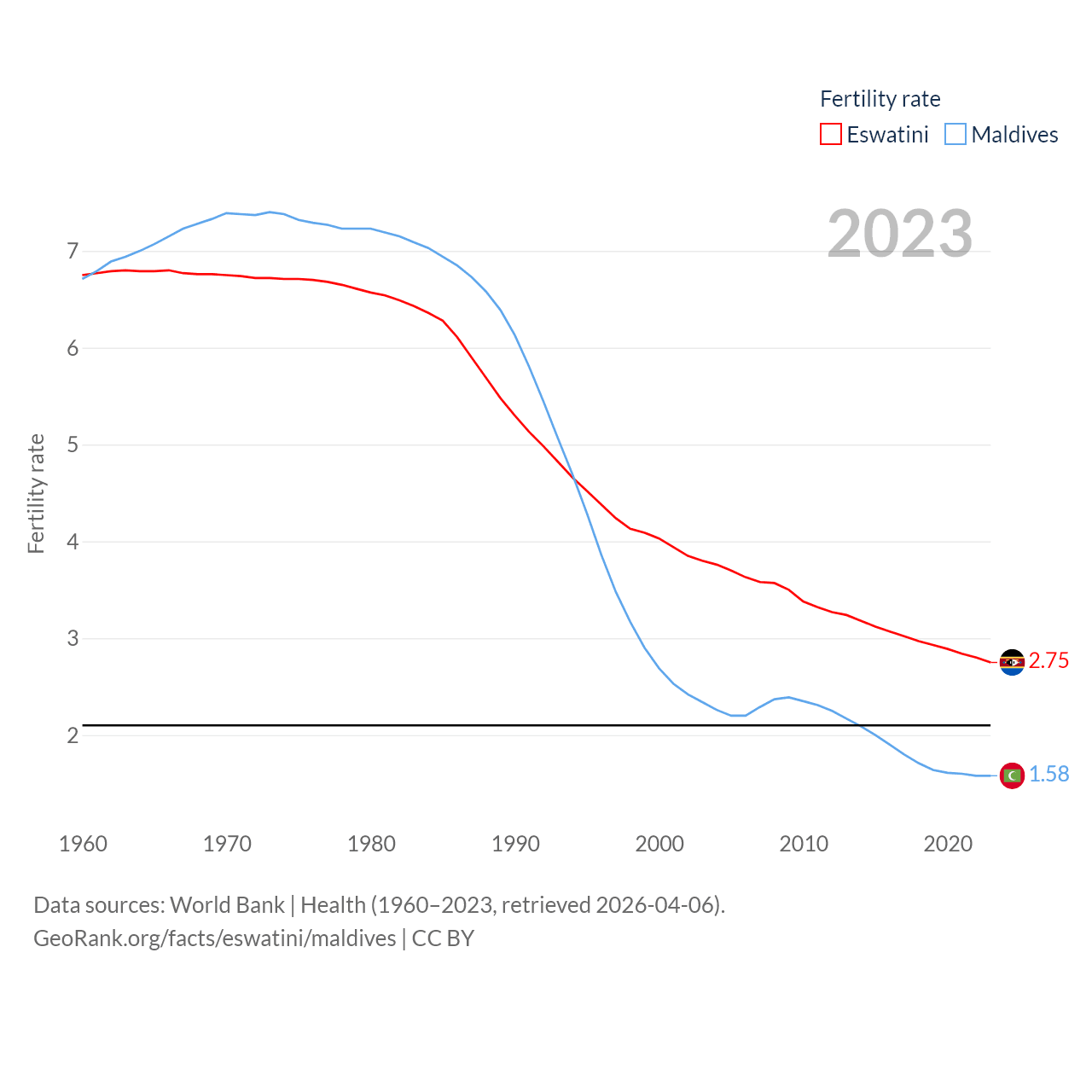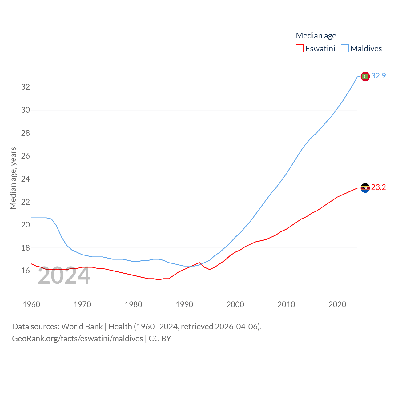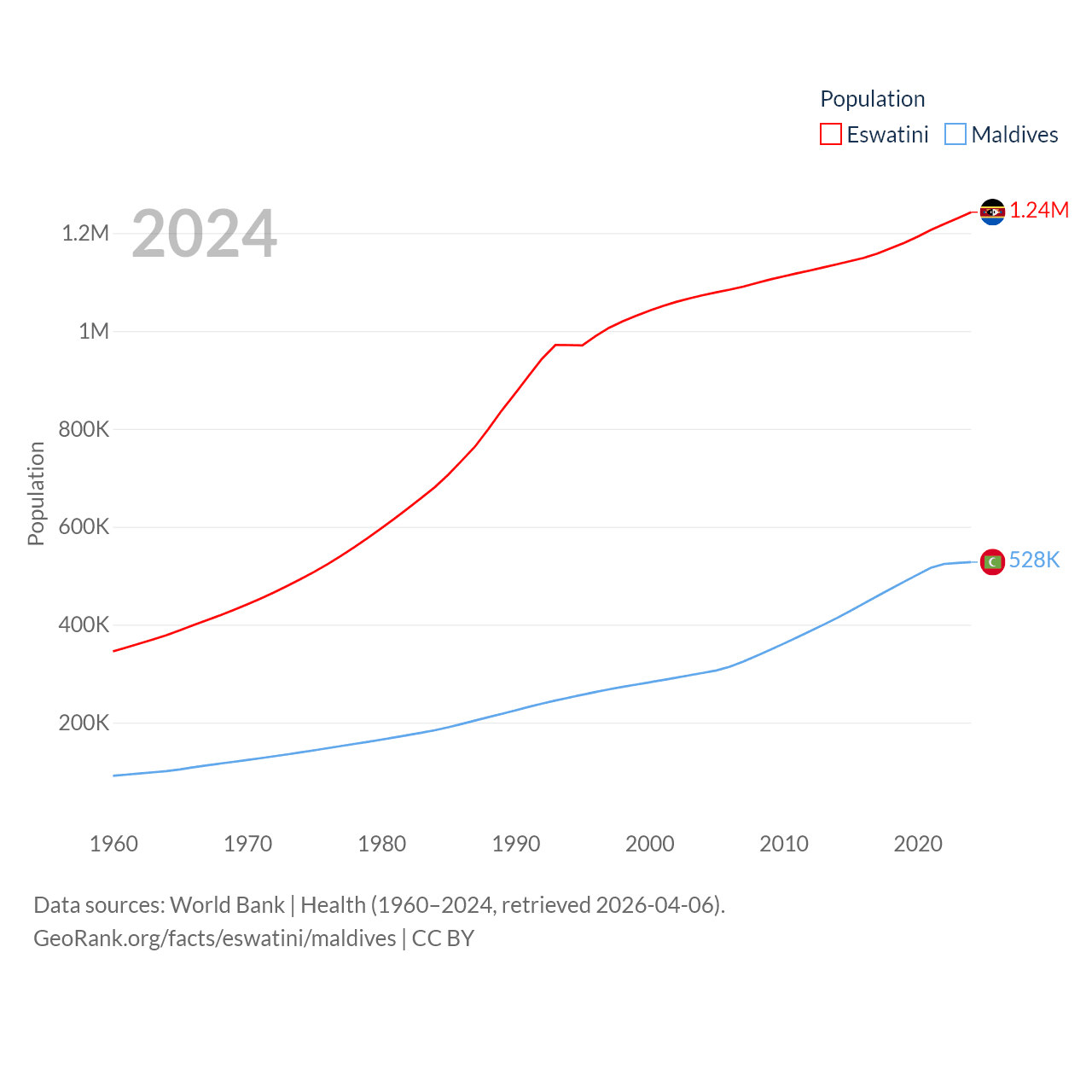 Eswatini has a population of 1.24M (ranked 157/197), compared with 528K in Maldives (ranked 168/197). Eswatini's land area is 6,641 sq mi versus 115.1 sq mi for Maldives (ranked 154th vs. 188th).