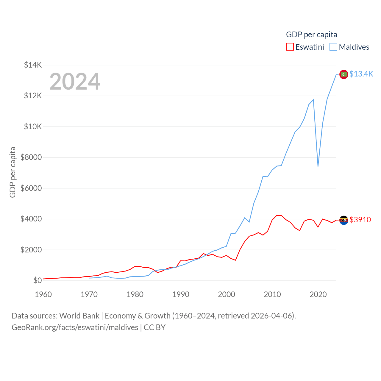 By GDP, Eswatini ranks 162/197 ($4.86B) and Maldives ranks 159/197 ($7.06B). By GDP per capita, Eswatini ranks 131/197 ($3,910), while Maldives ranks 75/197 ($13,379).