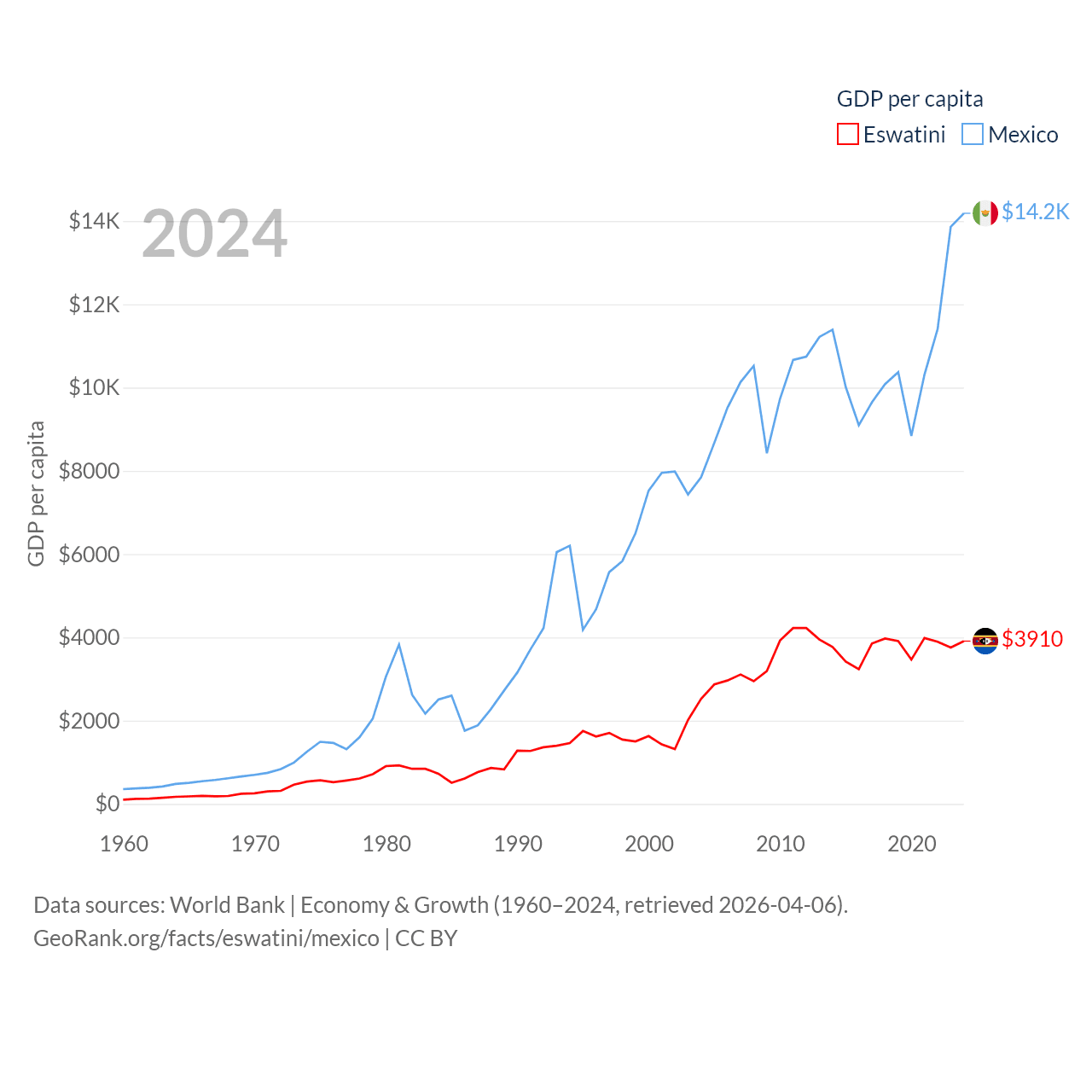 By GDP, Eswatini ranks 162/197 ($4.86B) and Mexico ranks 13/197 ($1.86T). By GDP per capita, Eswatini ranks 131/197 ($3,910), while Mexico ranks 69/197 ($14,186).