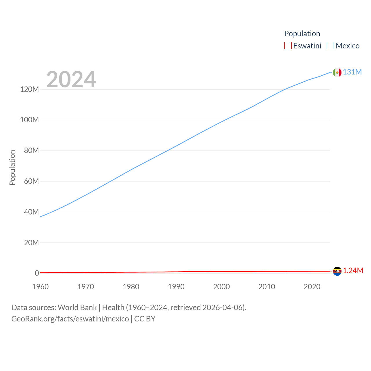 Eswatini has a population of 1.24M (ranked 157/197), compared with 131M in Mexico (ranked 11/197). Eswatini's land area is 6,641 sq mi versus 750,563 sq mi for Mexico (ranked 154th vs. 13th).