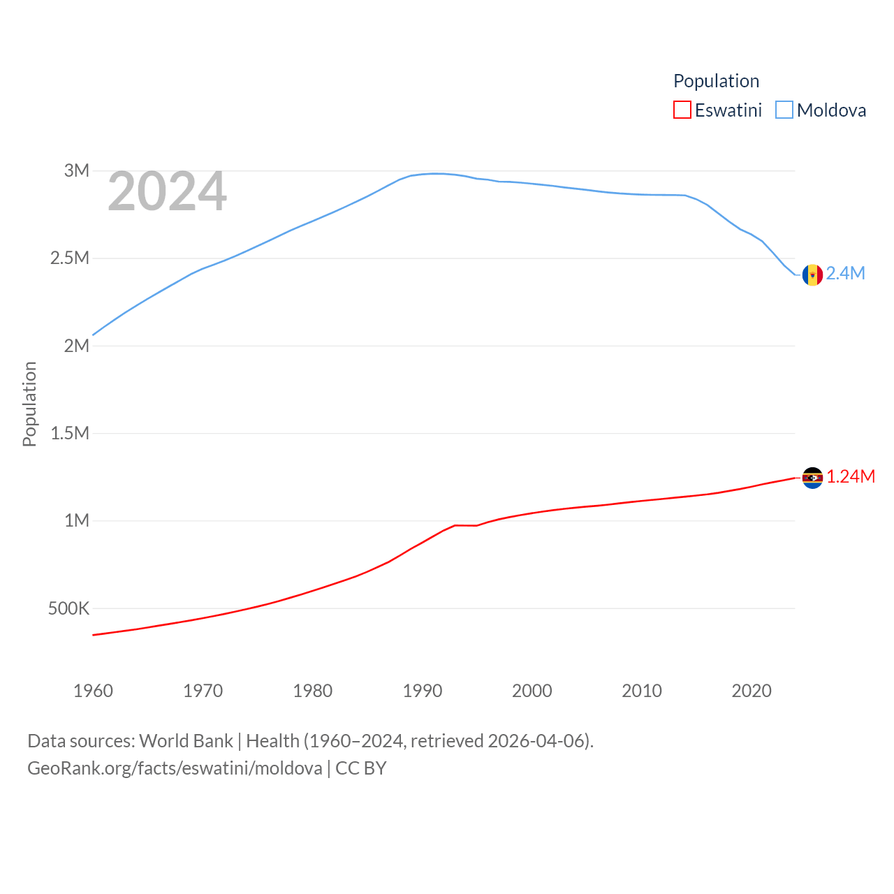 Eswatini has a population of 1.24M (ranked 157/197), compared with 2.4M in Moldova (ranked 143/197). Eswatini's land area is 6,641 sq mi versus 12,714 sq mi for Moldova (ranked 154th vs. 135th).