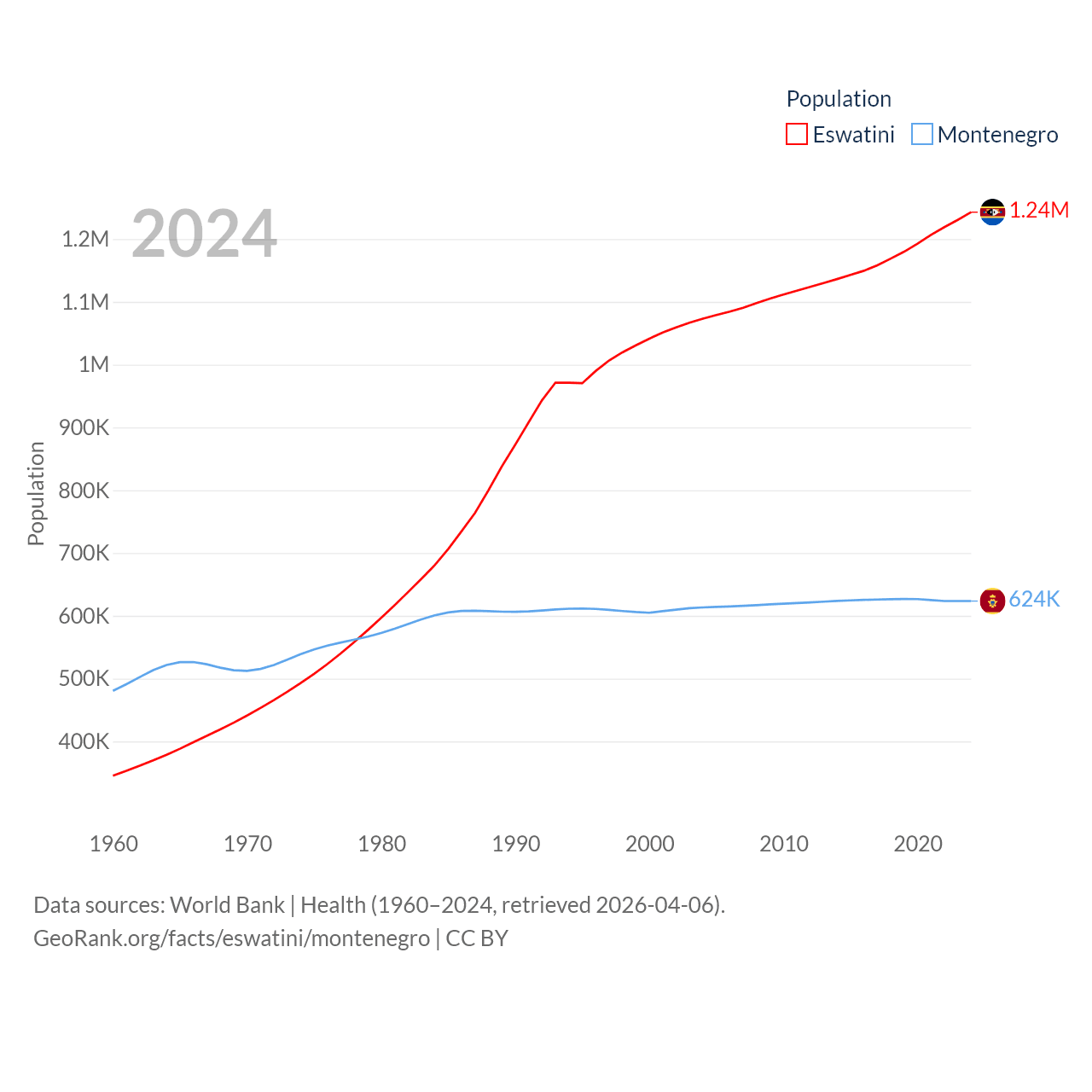 Eswatini has a population of 1.24M (ranked 157/197), compared with 624K in Montenegro (ranked 166/197). Eswatini's land area is 6,641 sq mi versus 5,193 sq mi for Montenegro (ranked 154th vs. 156th).