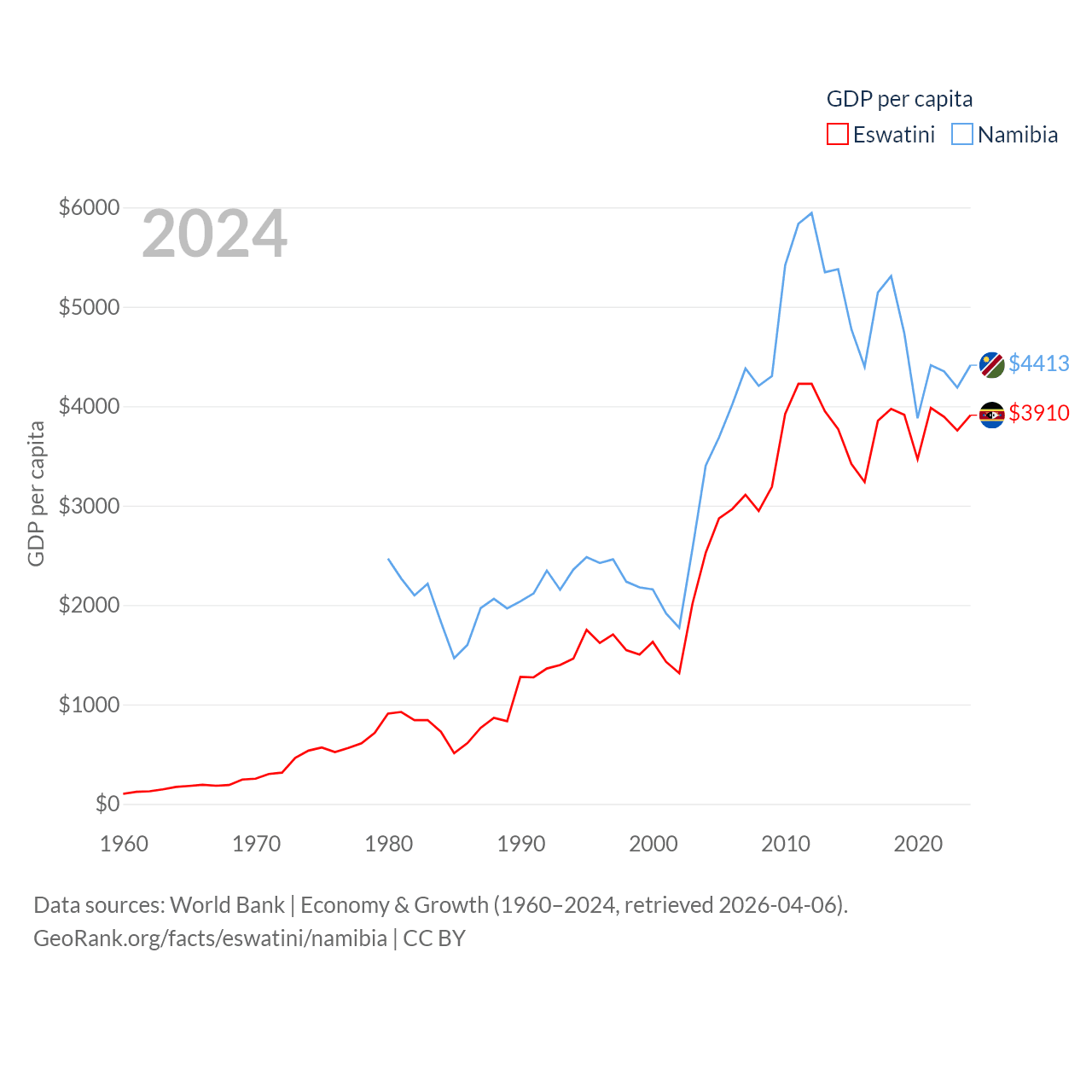 By GDP, Eswatini ranks 162/197 ($4.86B) and Namibia ranks 147/197 ($13.4B). By GDP per capita, Eswatini ranks 131/197 ($3,910), while Namibia ranks 126/197 ($4,413).