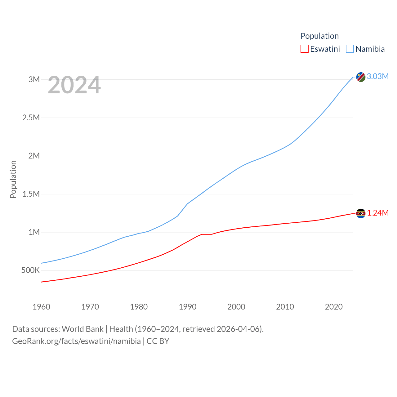 Eswatini has a population of 1.24M (ranked 157/197), compared with 3.03M in Namibia (ranked 136/197). Eswatini's land area is 6,641 sq mi versus 317,874 sq mi for Namibia (ranked 154th vs. 33rd).
