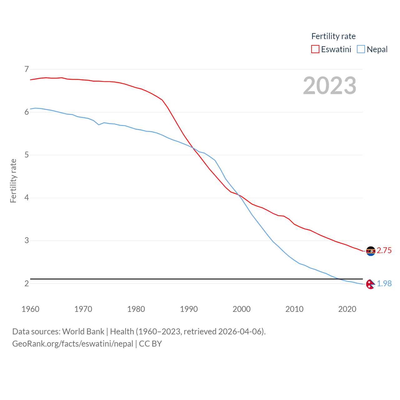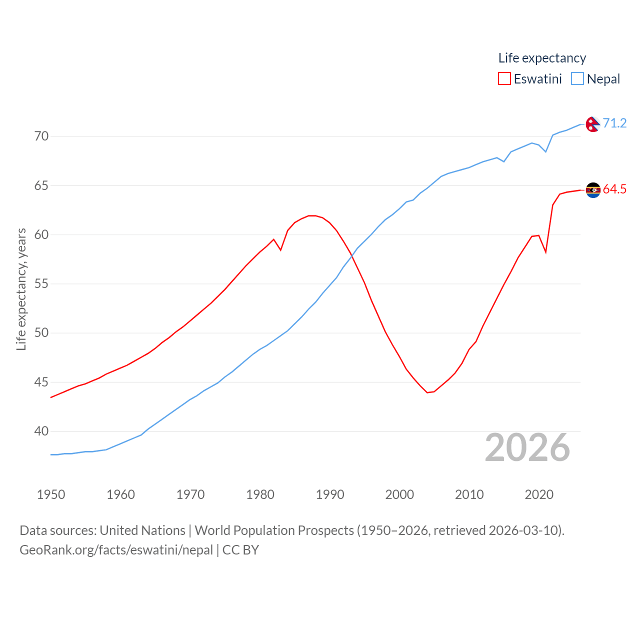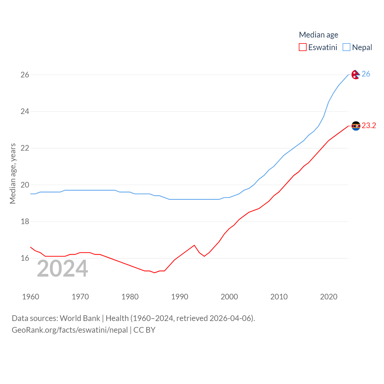 Eswatini has a population of 1.24M (ranked 157/197), compared with 29.7M in Nepal (ranked 51/197). Eswatini's land area is 6,641 sq mi versus 55,348 sq mi for Nepal (ranked 154th vs. 92nd).