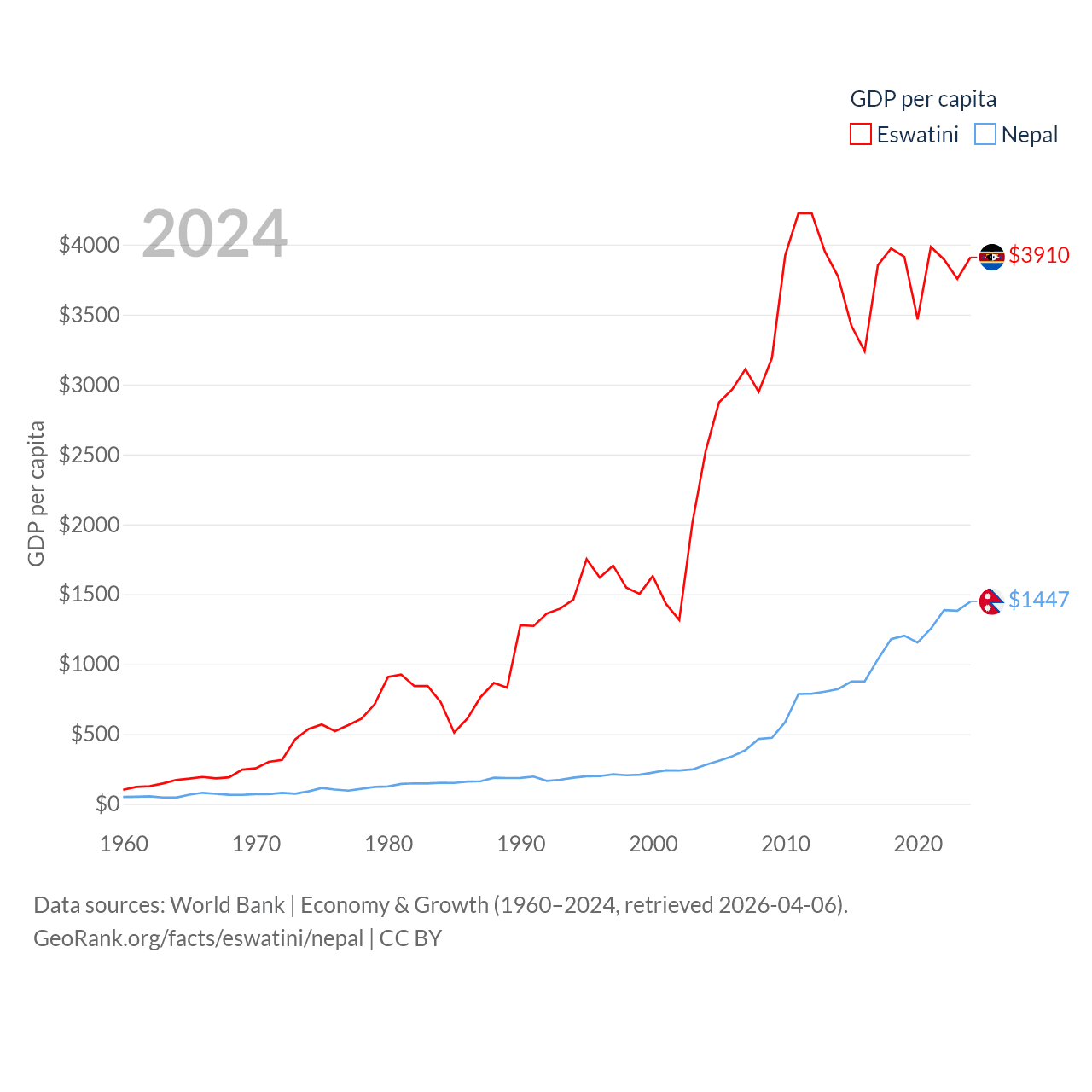 By GDP, Eswatini ranks 162/197 ($4.86B) and Nepal ranks 101/197 ($42.9B). By GDP per capita, Eswatini ranks 131/197 ($3,910), while Nepal ranks 164/197 ($1,447).