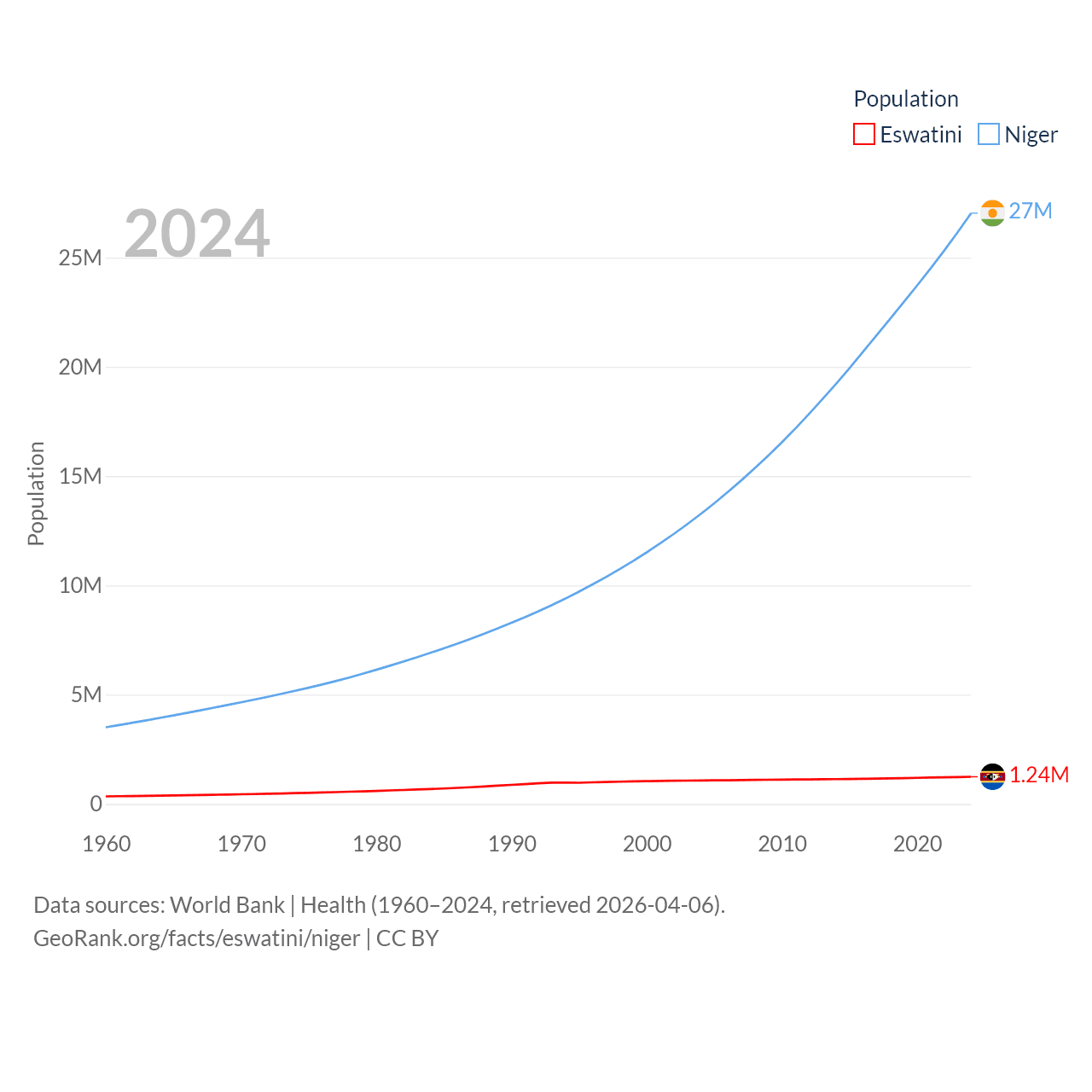 Eswatini has a population of 1.24M (ranked 157/197), compared with 27M in Niger (ranked 55/197). Eswatini's land area is 6,641 sq mi versus 489,076 sq mi for Niger (ranked 154th vs. 20th).