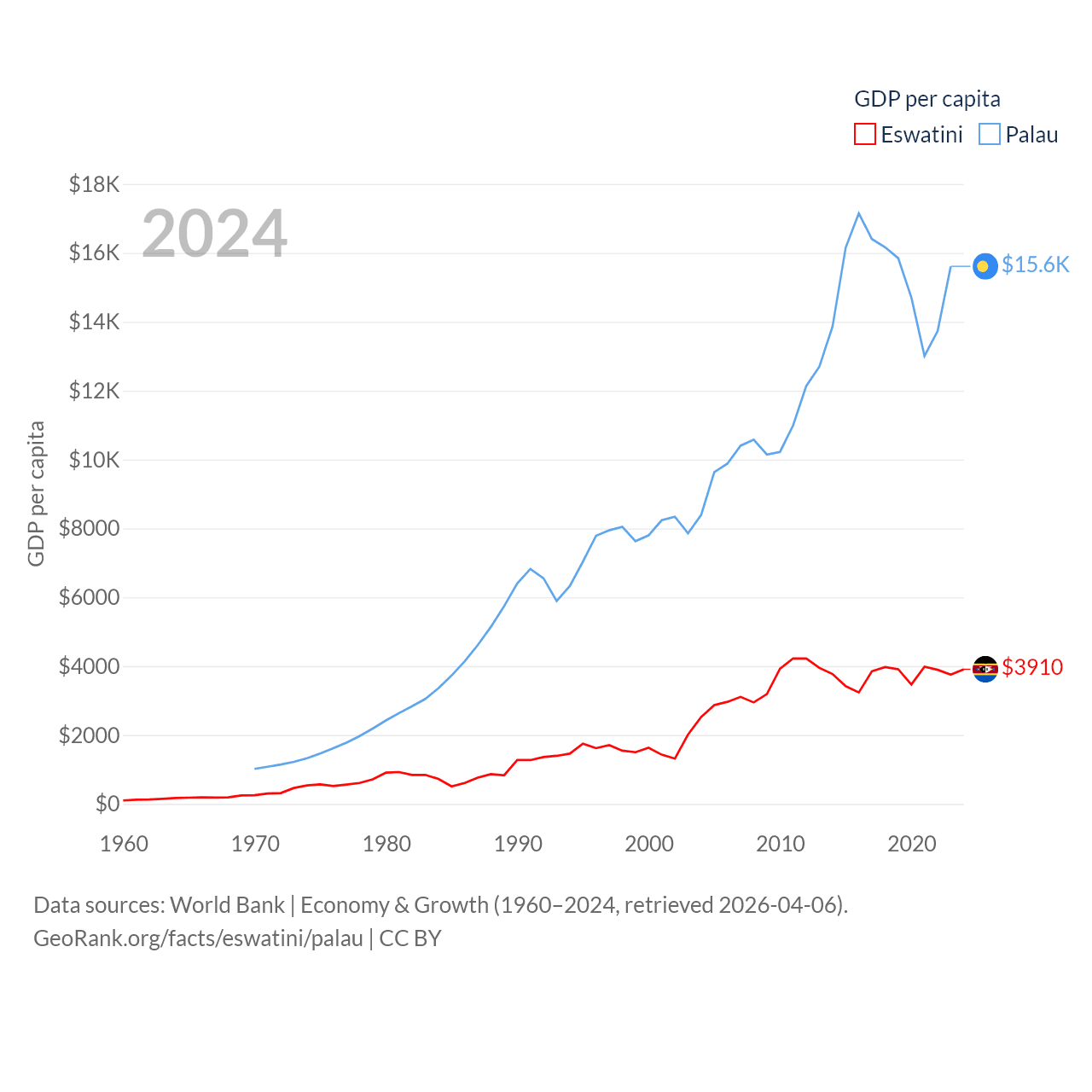By GDP, Eswatini ranks 162/197 ($4.86B) and Palau ranks 194/197 ($277M). By GDP per capita, Eswatini ranks 131/197 ($3,910), while Palau ranks 67/197 ($15,611).