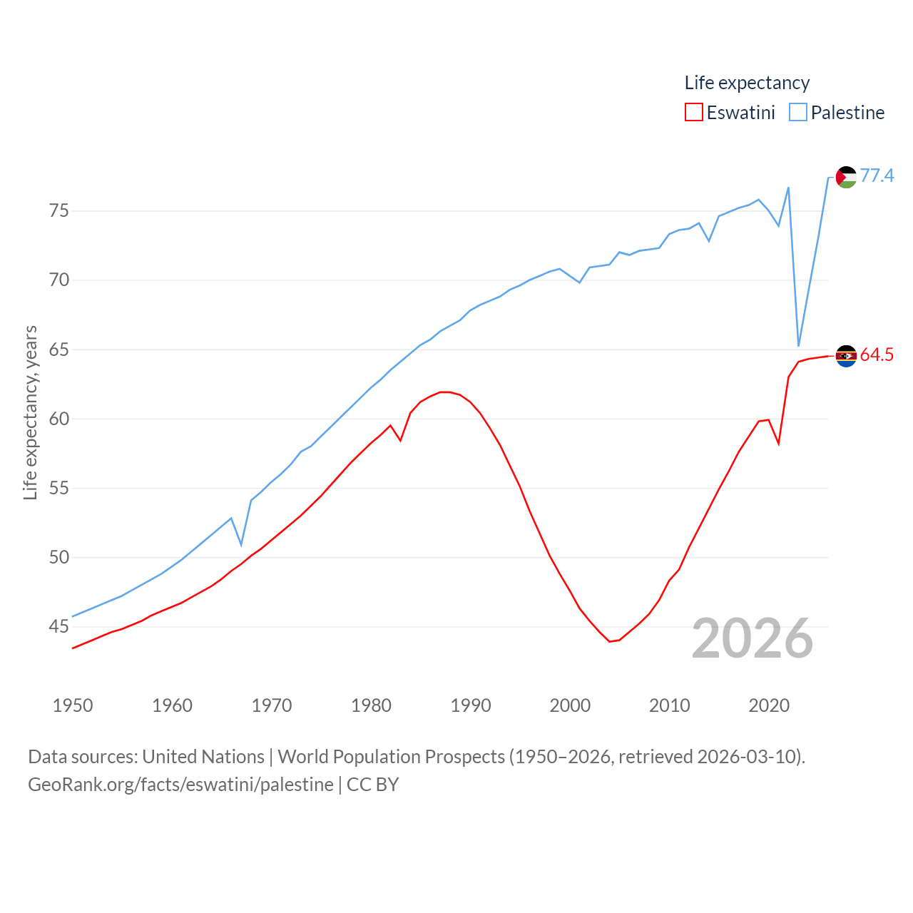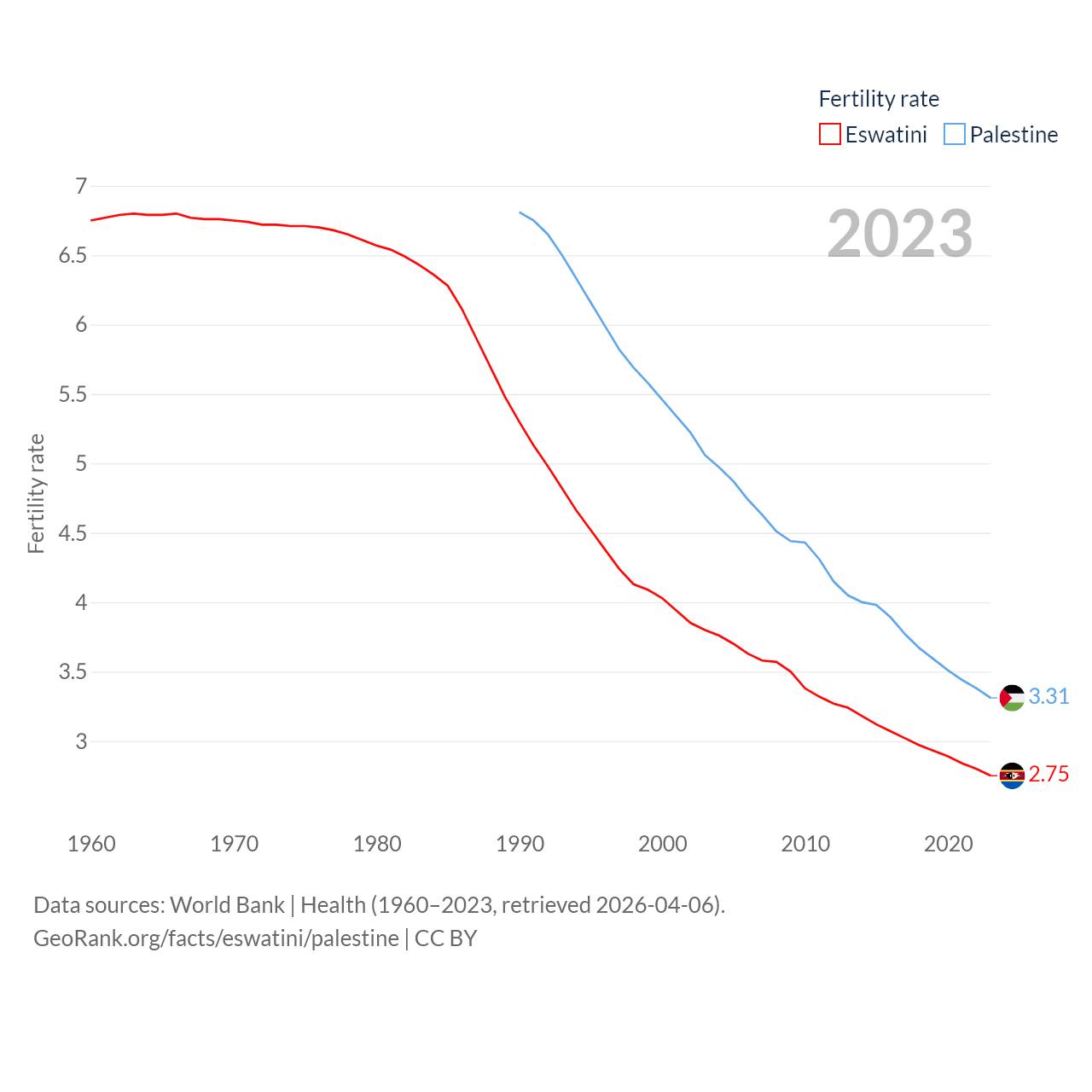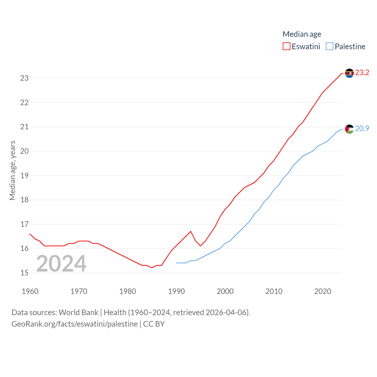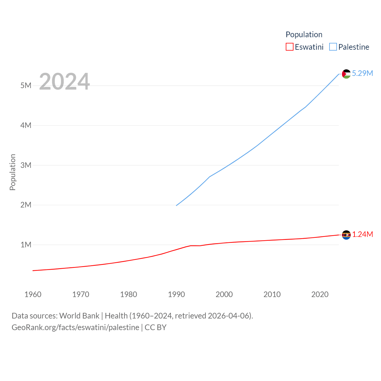 Eswatini has a population of 1.24M (ranked 157/197), compared with 5.29M in Palestine (ranked 122/197). Eswatini's land area is 6,641 sq mi versus 2,326 sq mi for Palestine (ranked 154th vs. 164th).