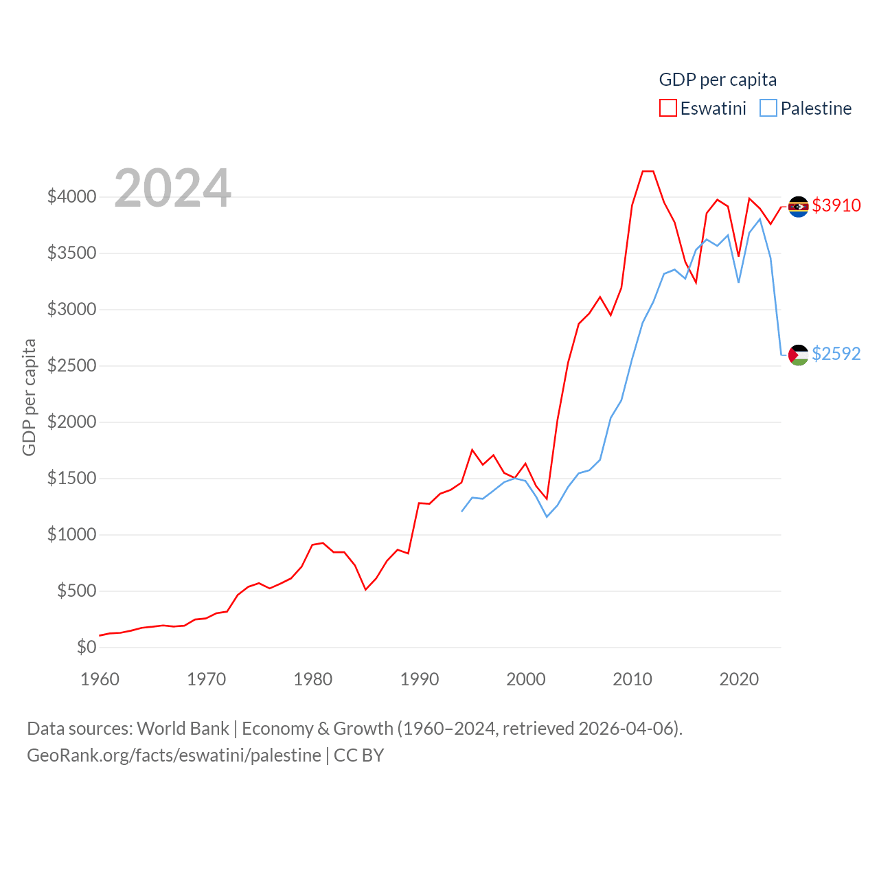 By GDP, Eswatini ranks 162/197 ($4.86B) and Palestine ranks 146/197 ($13.7B). By GDP per capita, Eswatini ranks 131/197 ($3,910), while Palestine ranks 147/197 ($2,592).