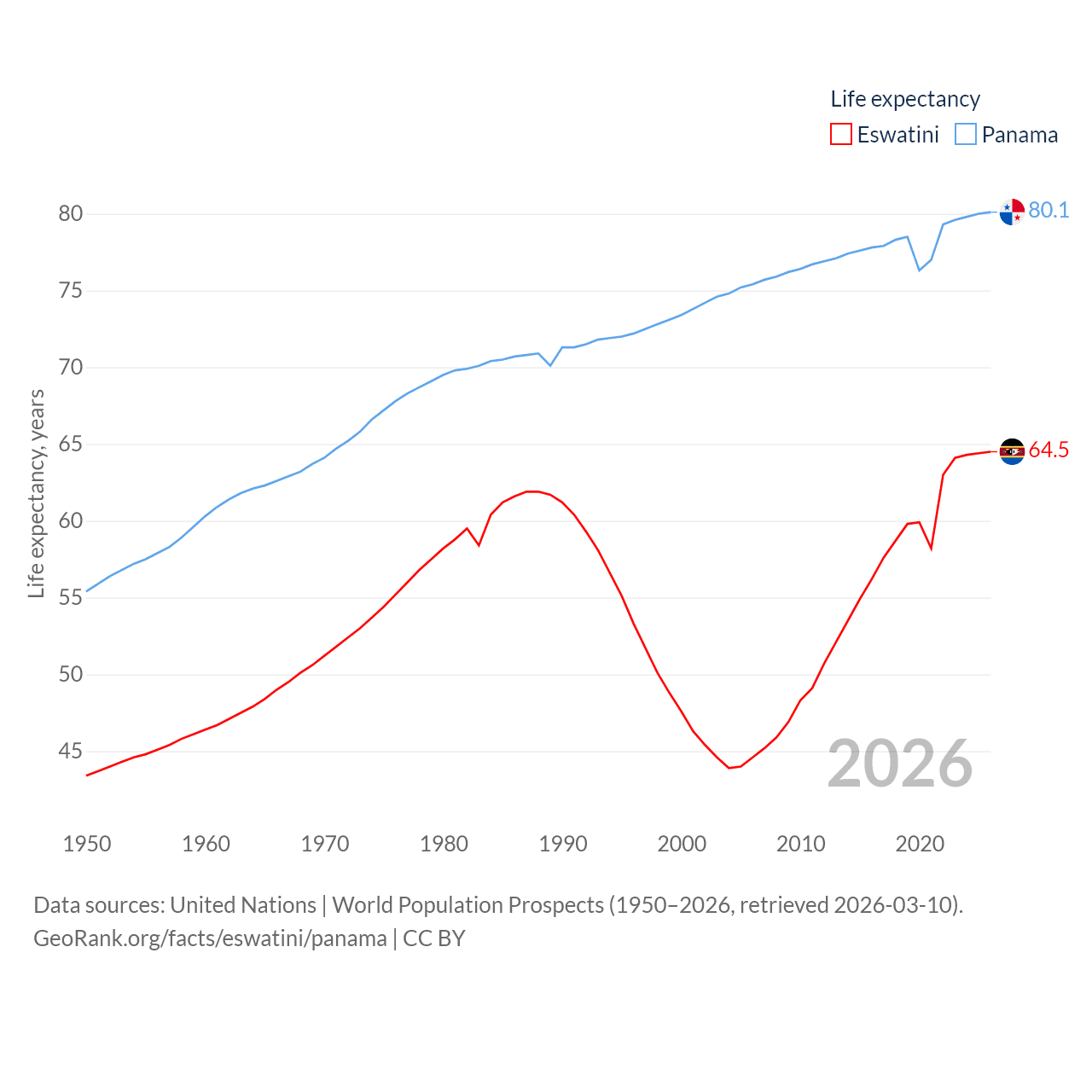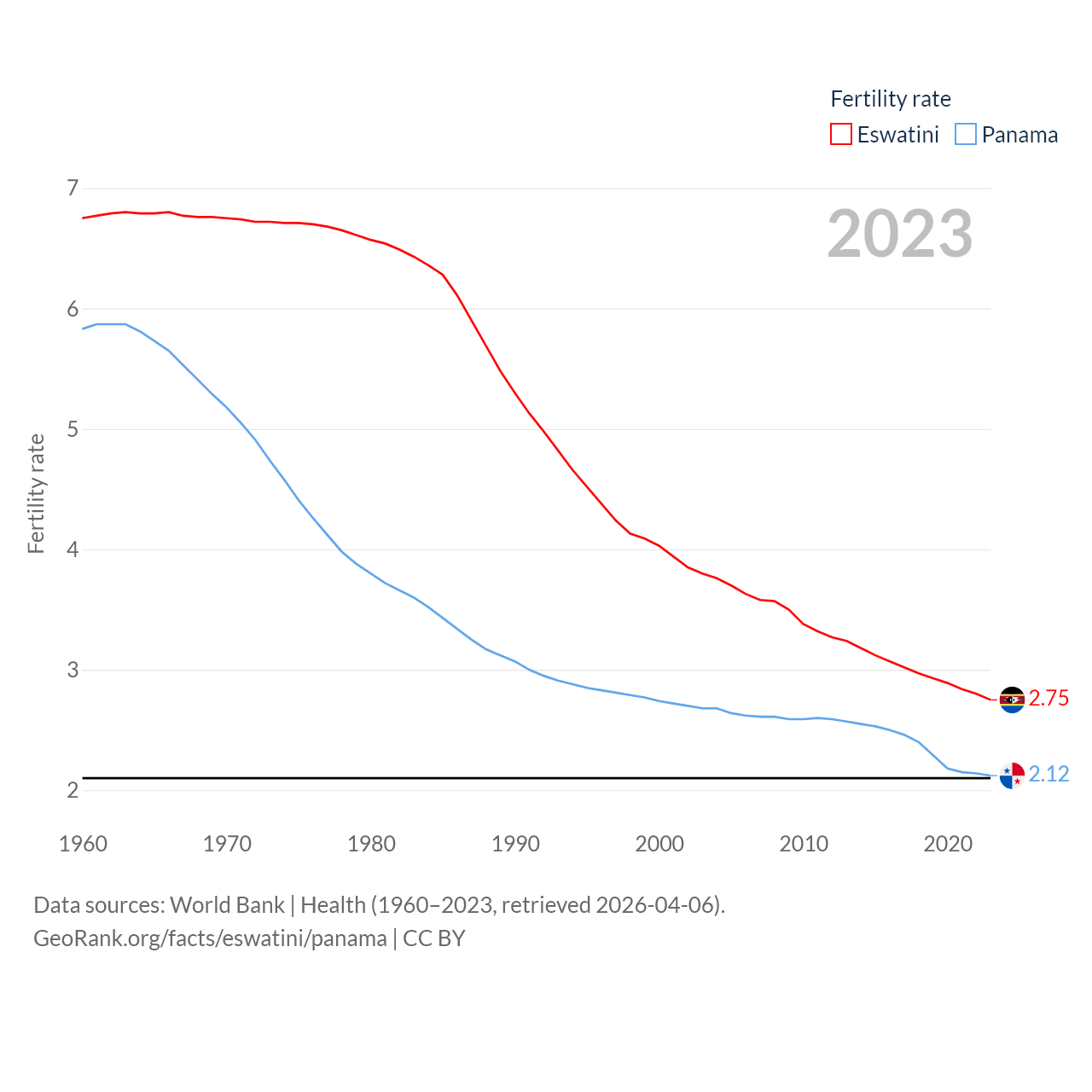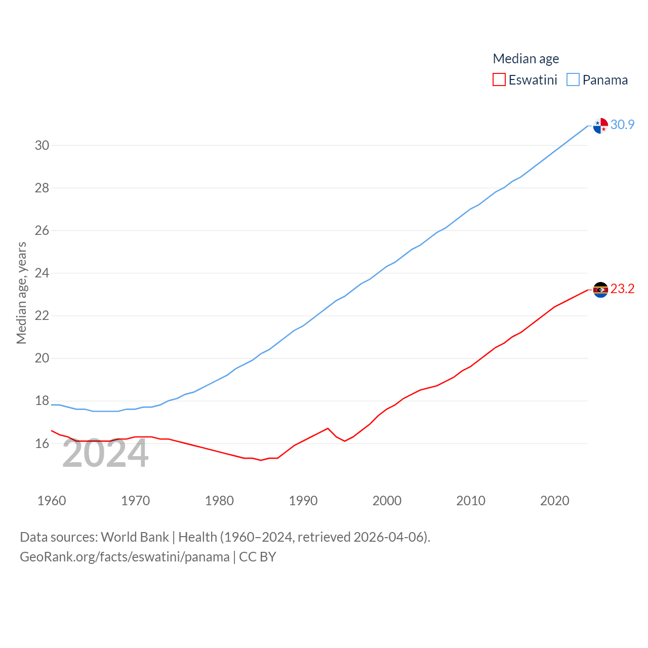 Eswatini has a population of 1.24M (ranked 157/197), compared with 4.52M in Panama (ranked 128/197). Eswatini's land area is 6,641 sq mi versus 28,641 sq mi for Panama (ranked 154th vs. 115th).
