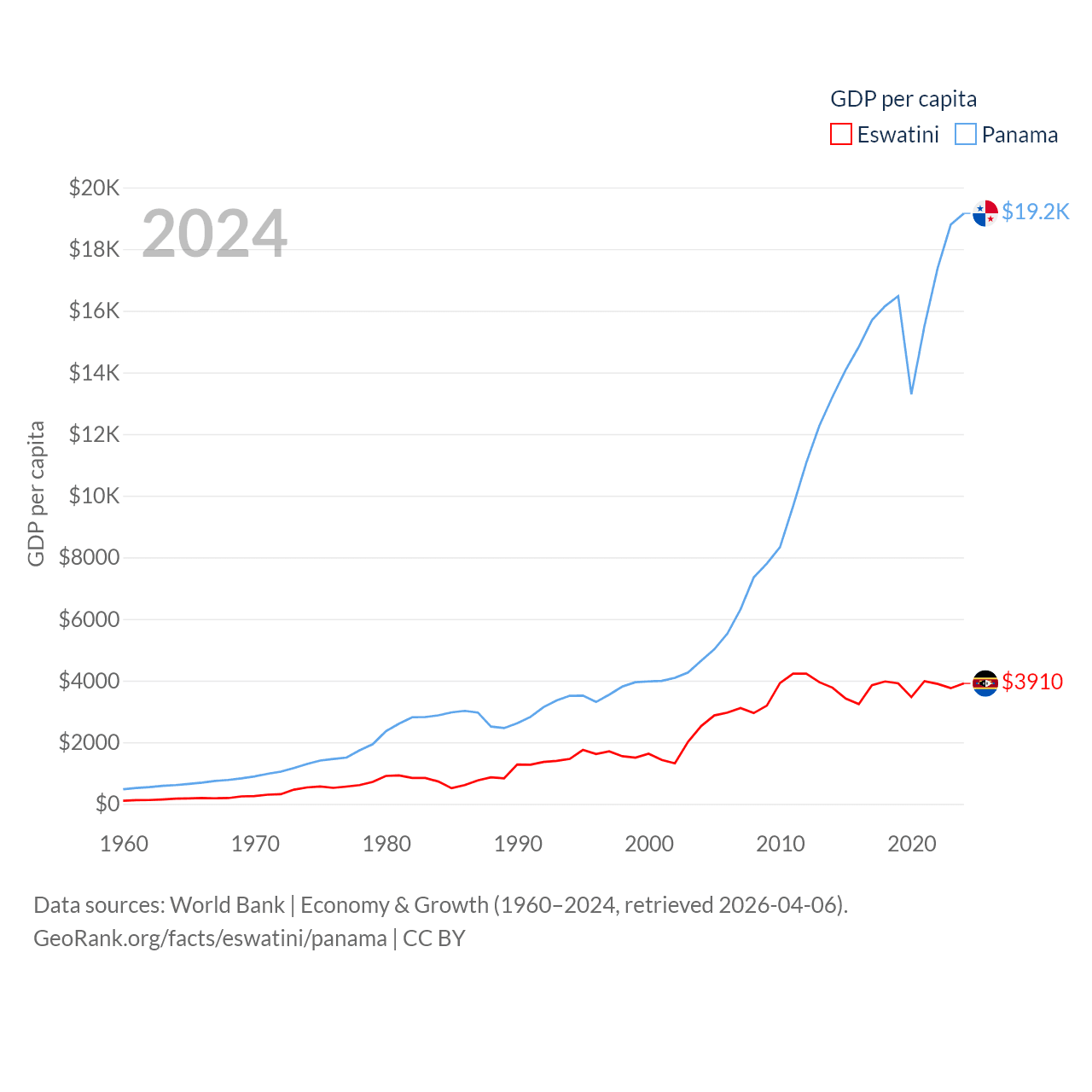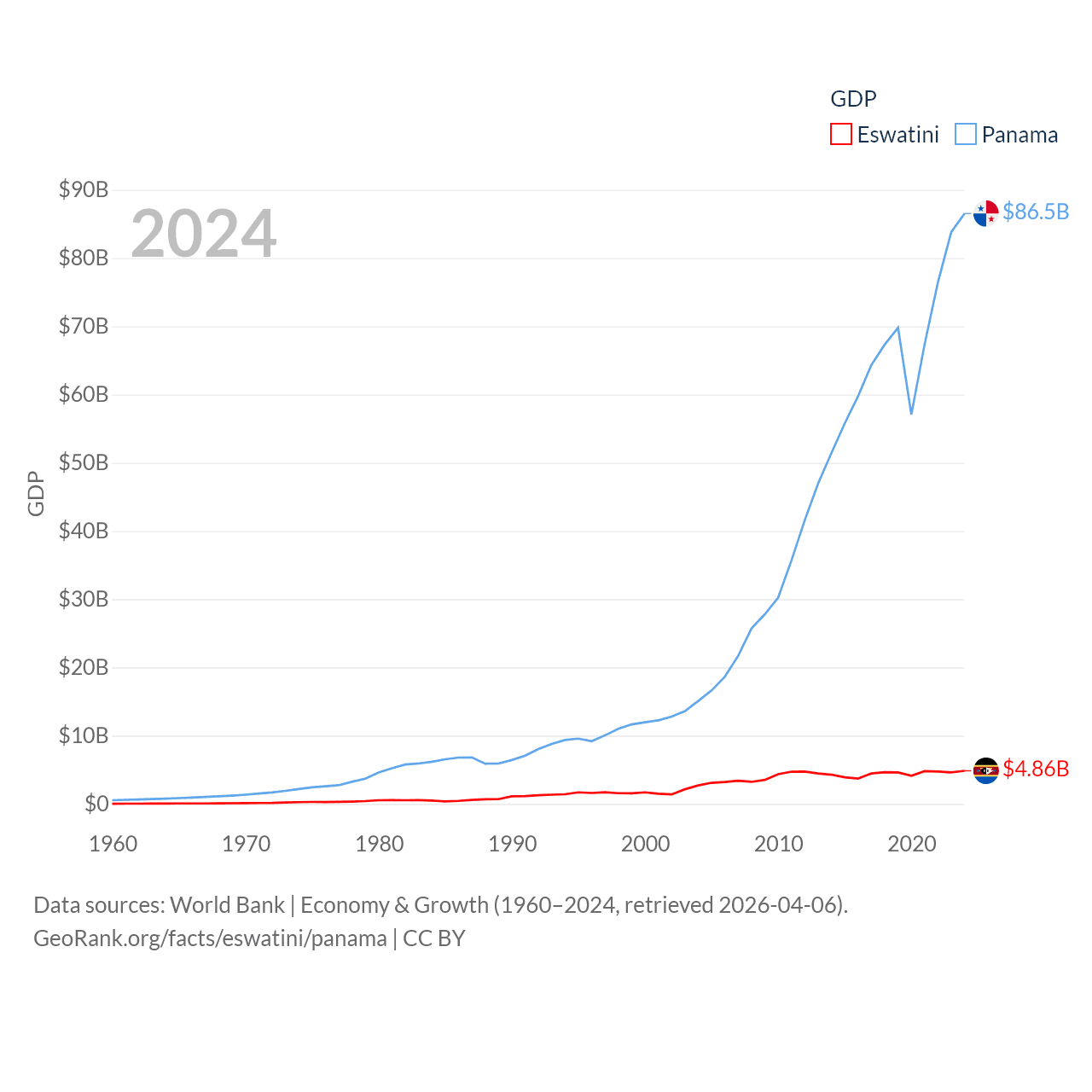 By GDP, Eswatini ranks 162/197 ($4.86B) and Panama ranks 78/197 ($86.5B). By GDP per capita, Eswatini ranks 131/197 ($3,910), while Panama ranks 60/197 ($19,161).