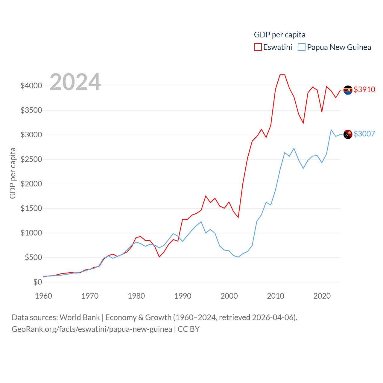 By GDP, Eswatini ranks 162/197 ($4.86B) and Papua New Guinea ranks 110/197 ($31.8B). By GDP per capita, Eswatini ranks 131/197 ($3,910), while Papua New Guinea ranks 140/197 ($3,007).
