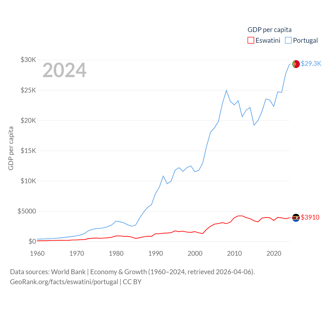 By GDP, Eswatini ranks 162/197 ($4.86B) and Portugal ranks 46/197 ($313B). By GDP per capita, Eswatini ranks 131/197 ($3,910), while Portugal ranks 44/197 ($29,292).