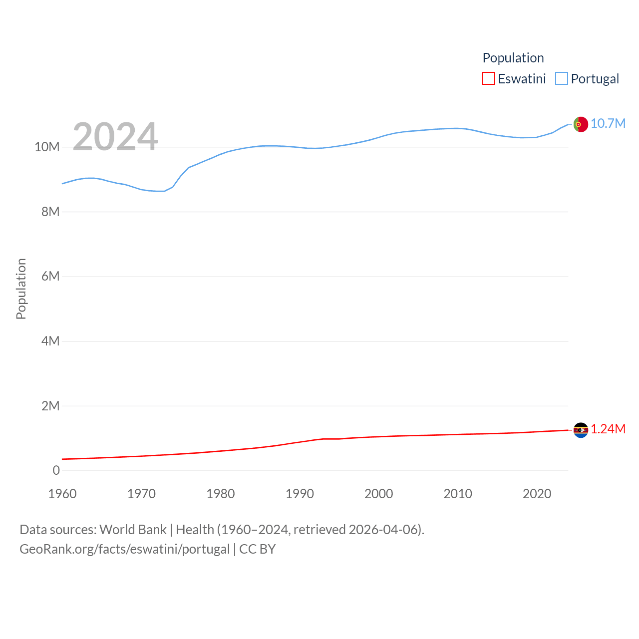 Eswatini has a population of 1.24M (ranked 157/197), compared with 10.7M in Portugal (ranked 90/197). Eswatini's land area is 6,641 sq mi versus 35,369 sq mi for Portugal (ranked 154th vs. 108th).