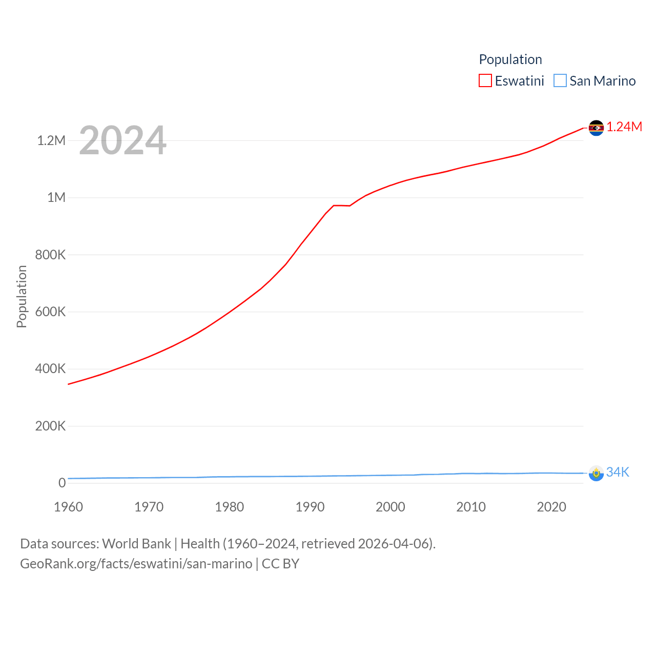 Eswatini has a population of 1.24M (ranked 157/197), compared with 34K in San Marino (ranked 193/197). Eswatini's land area is 6,641 sq mi versus 23.2 sq mi for San Marino (ranked 154th vs. 193rd).