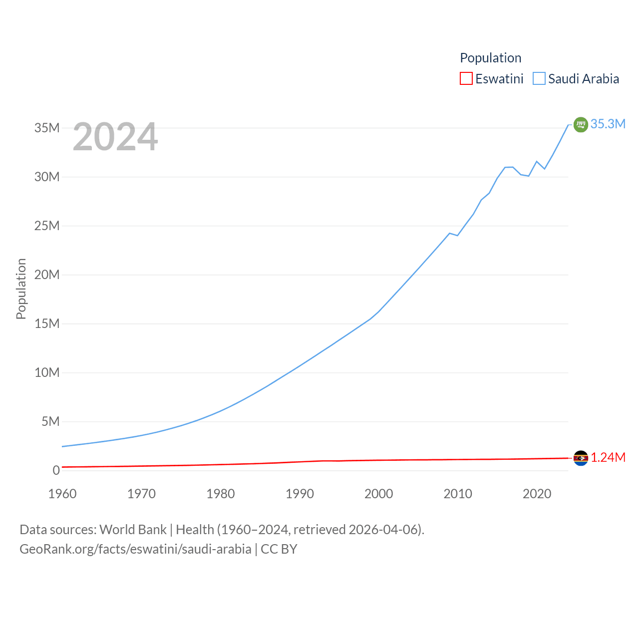 Eswatini has a population of 1.24M (ranked 157/197), compared with 35.3M in Saudi Arabia (ranked 45/197). Eswatini's land area is 6,641 sq mi versus 830,000 sq mi for Saudi Arabia (ranked 154th vs. 12th).