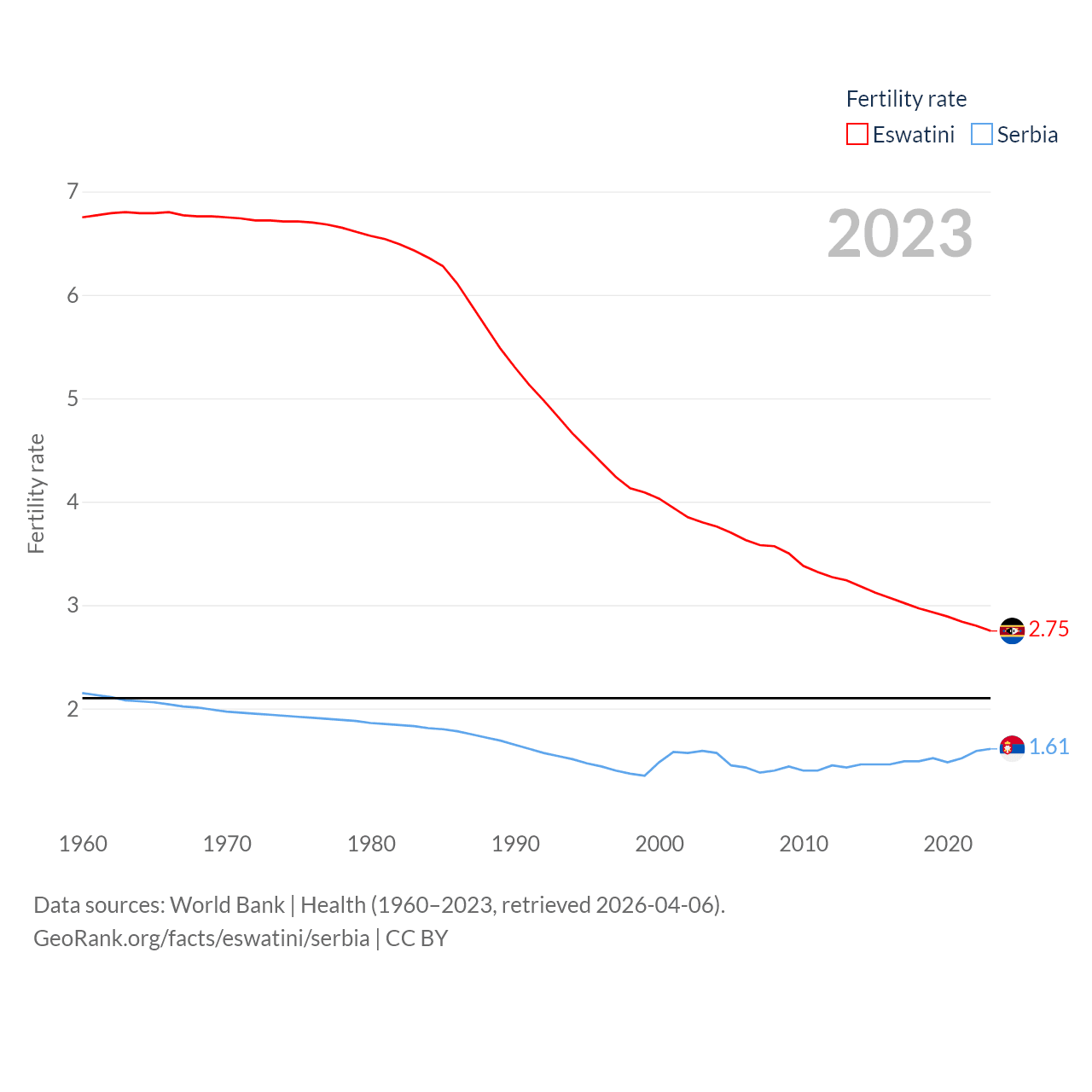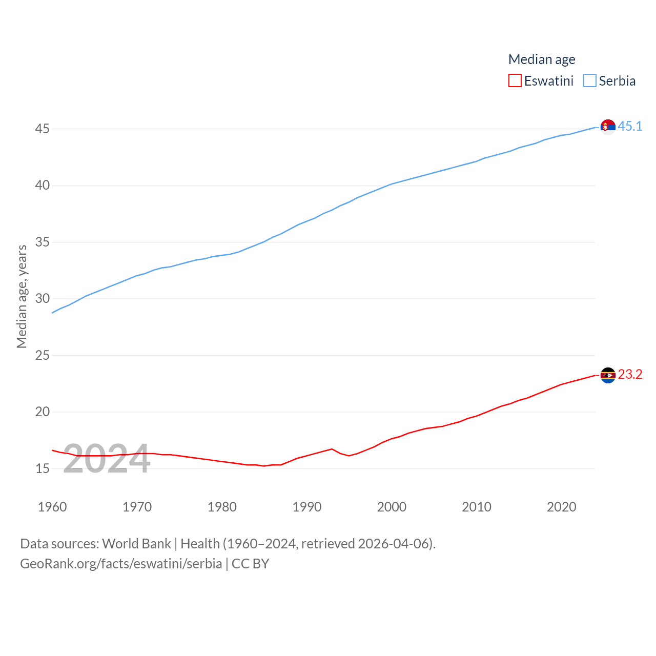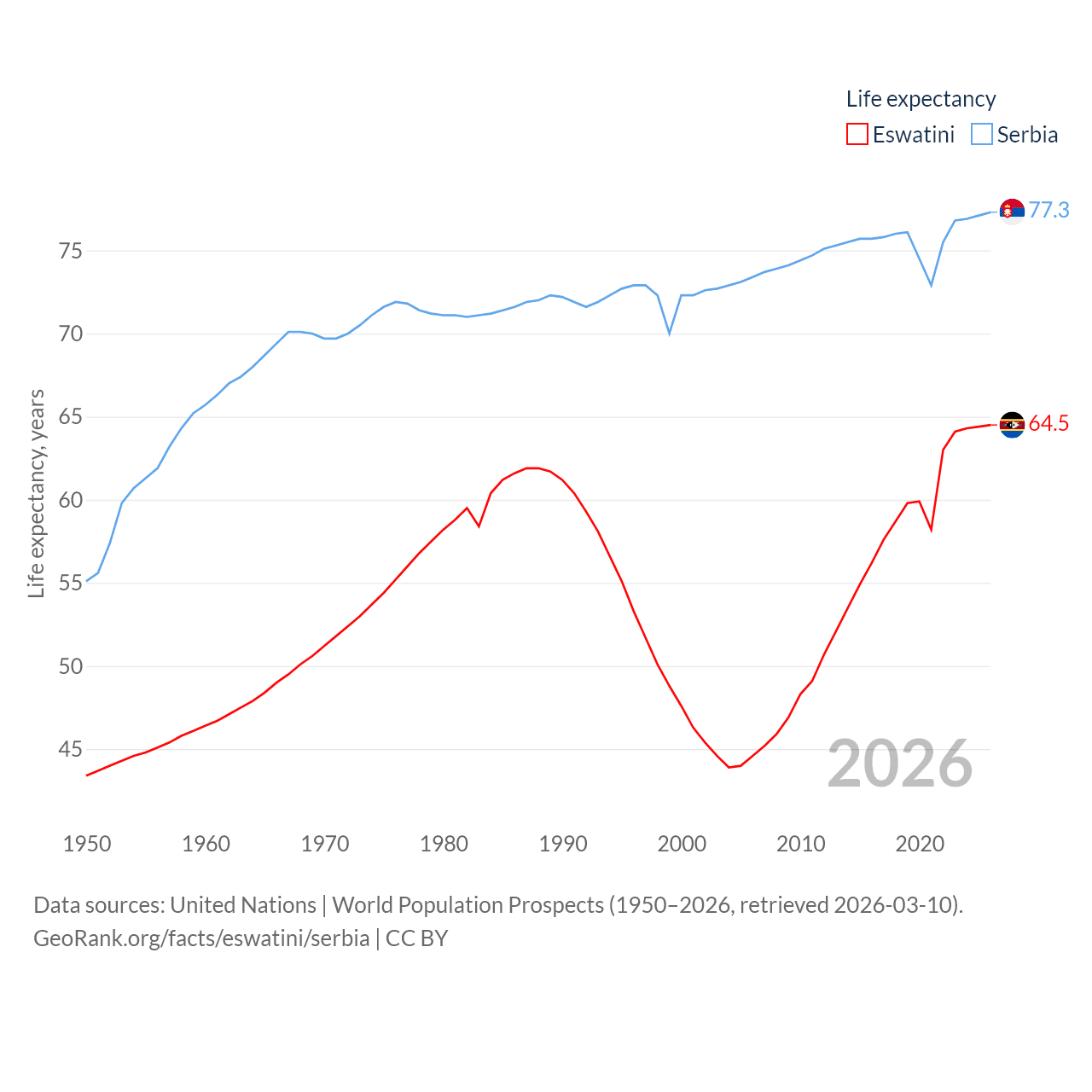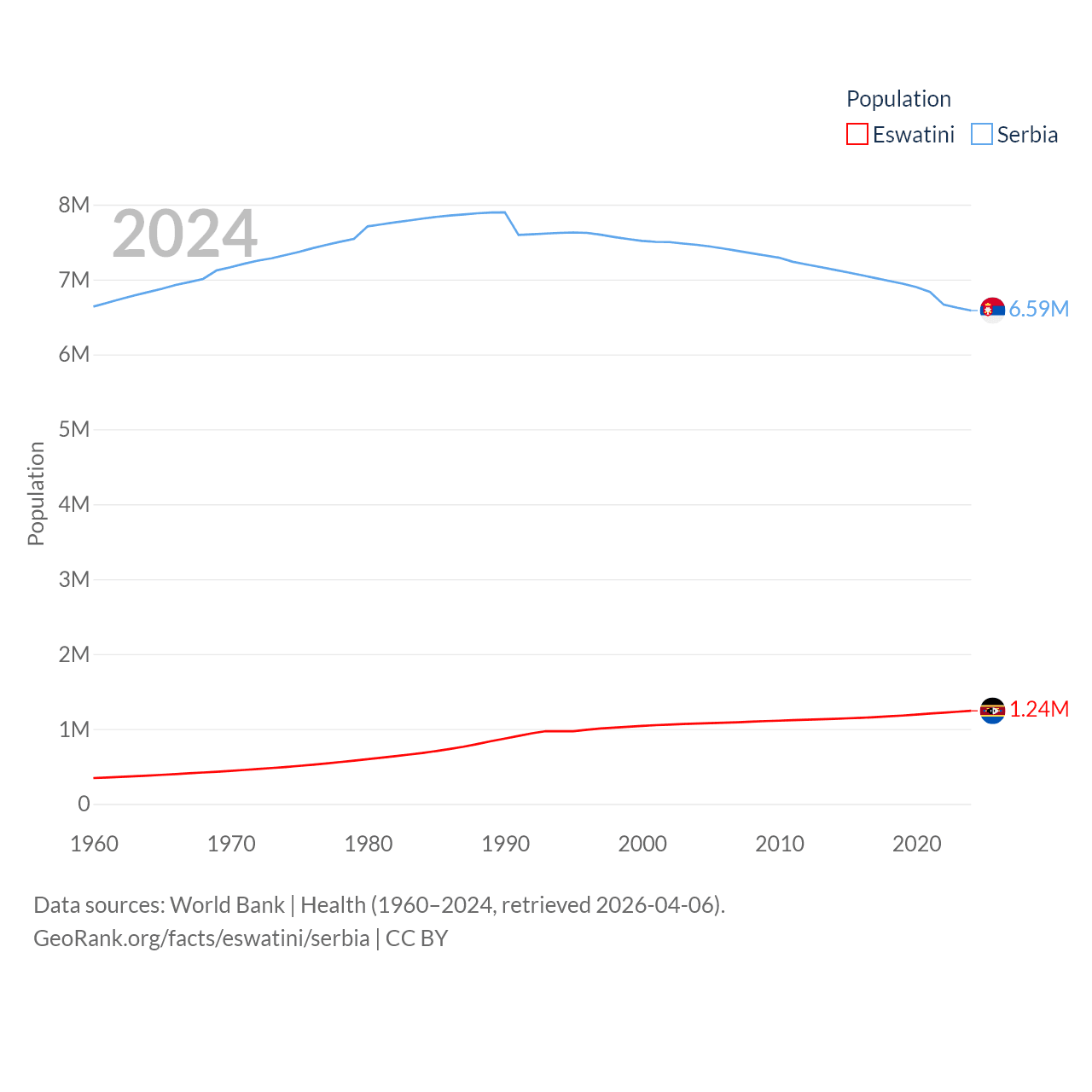 Eswatini has a population of 1.24M (ranked 157/197), compared with 6.59M in Serbia (ranked 109/197). Eswatini's land area is 6,641 sq mi versus 32,467 sq mi for Serbia (ranked 154th vs. 111th).