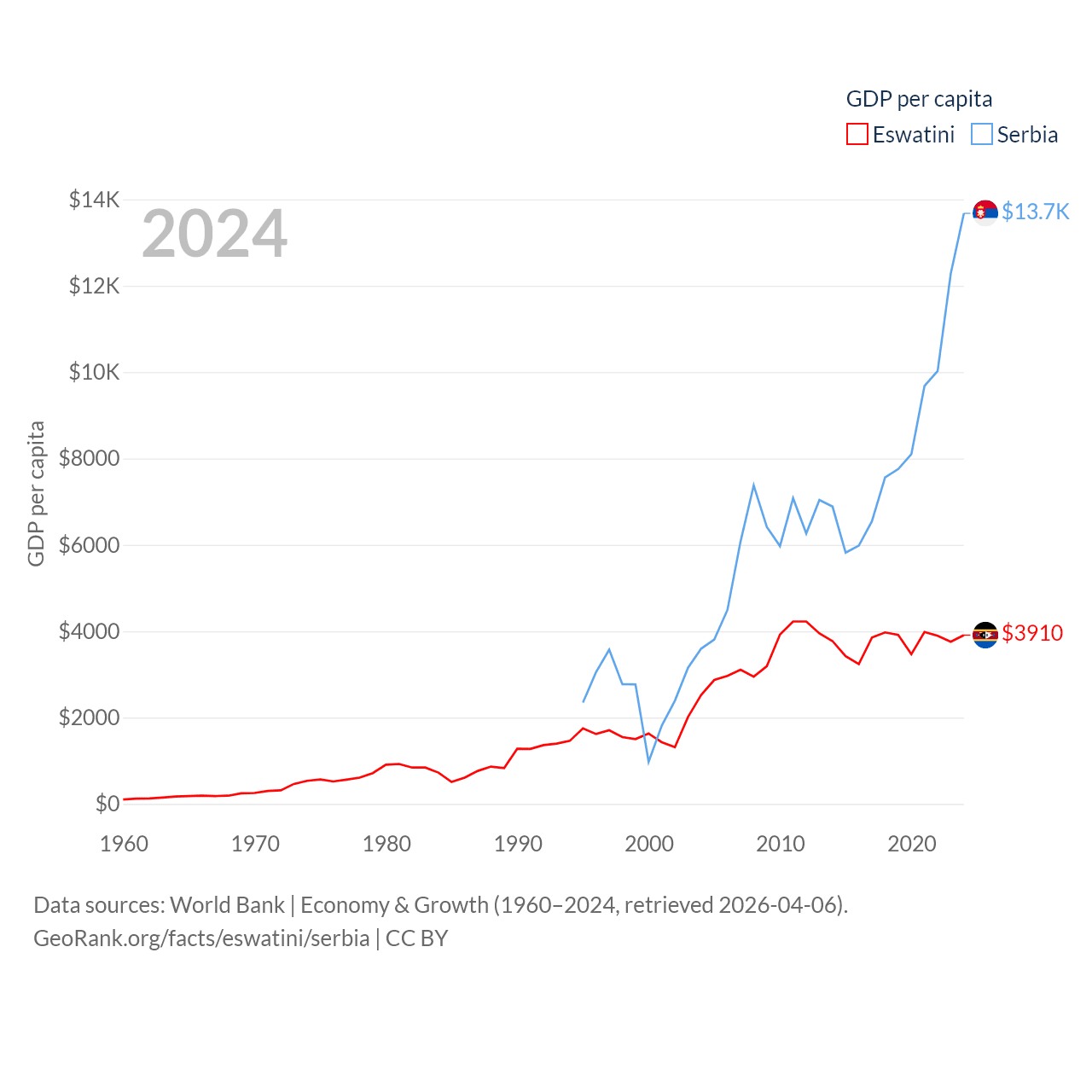 By GDP, Eswatini ranks 162/197 ($4.86B) and Serbia ranks 76/197 ($90.1B). By GDP per capita, Eswatini ranks 131/197 ($3,910), while Serbia ranks 73/197 ($13,679).