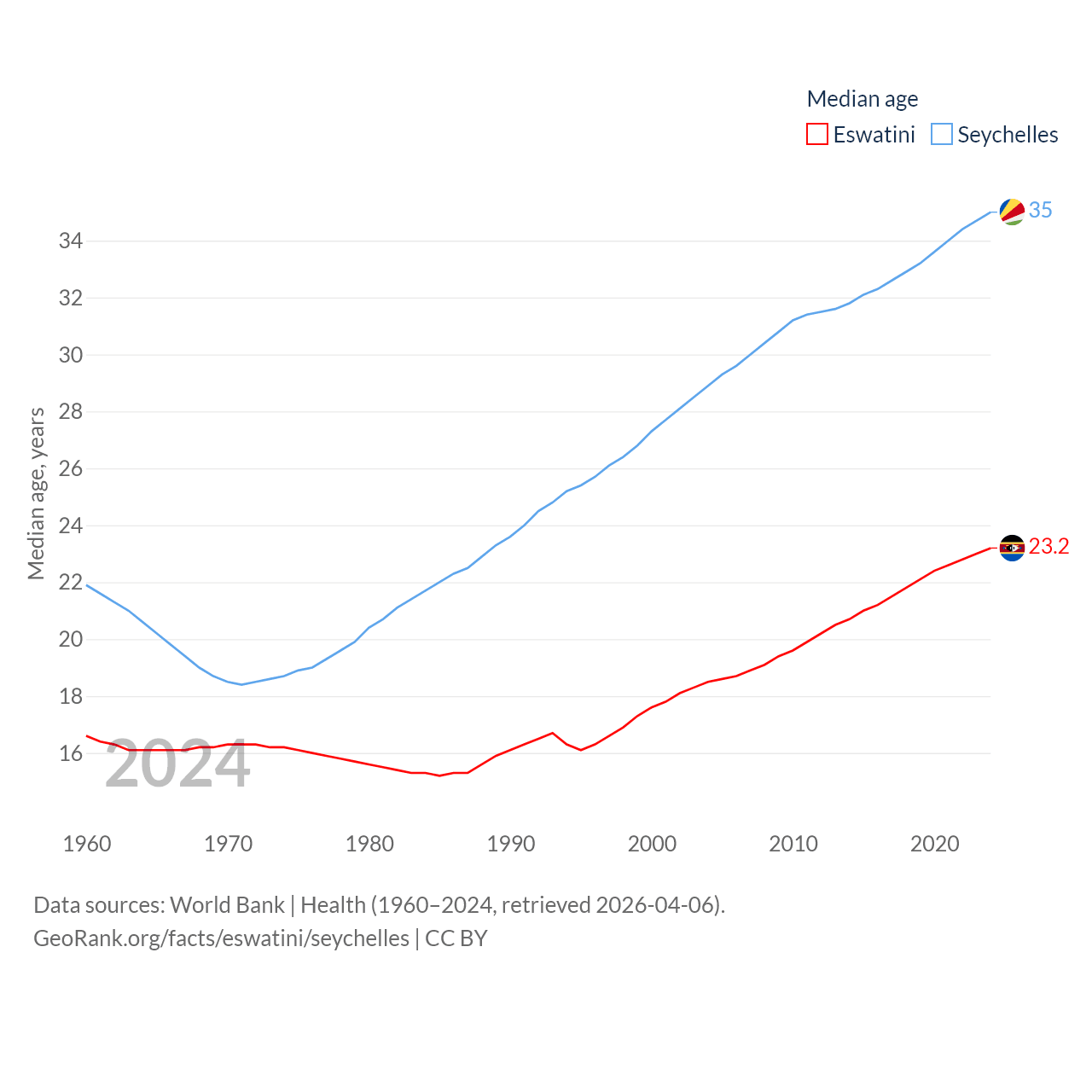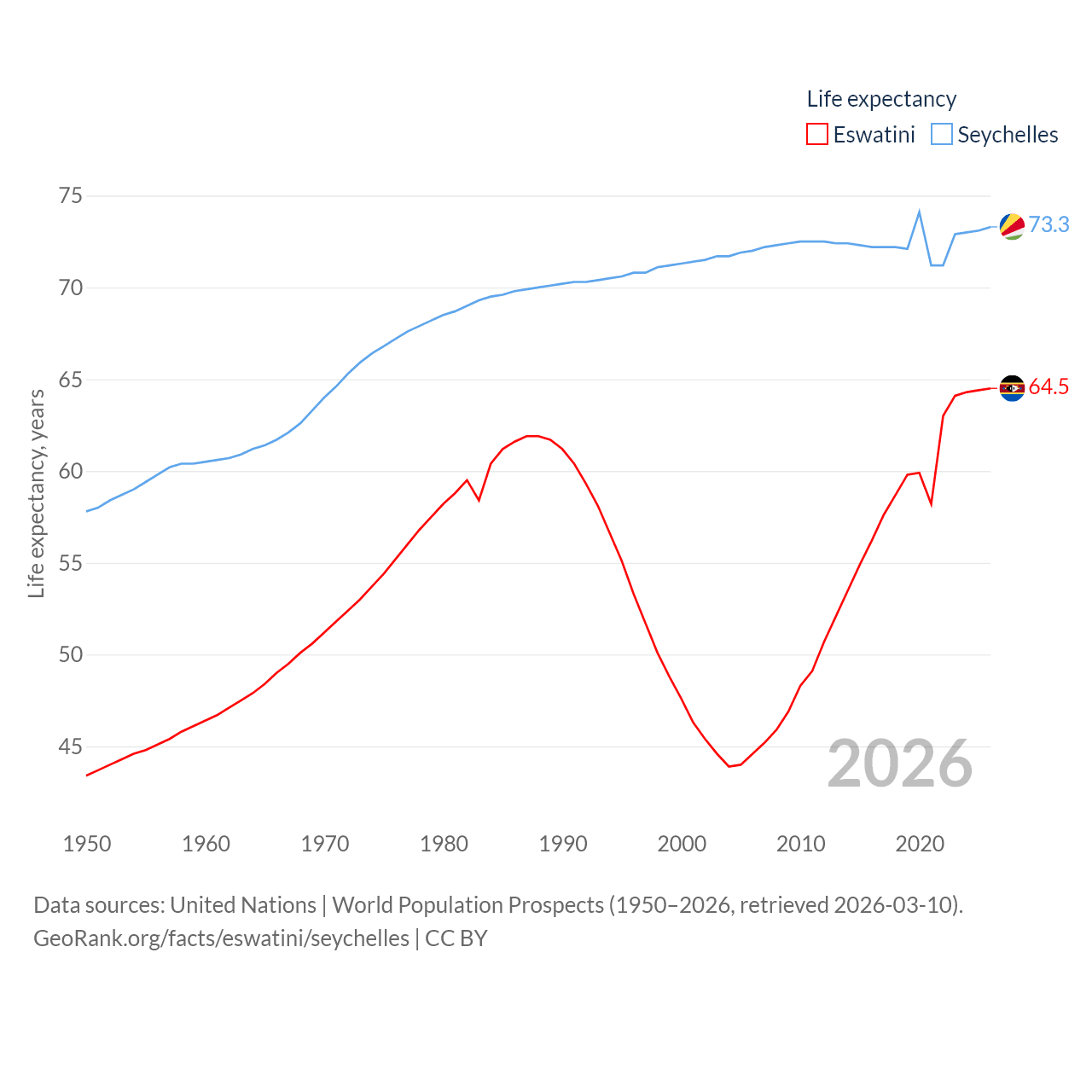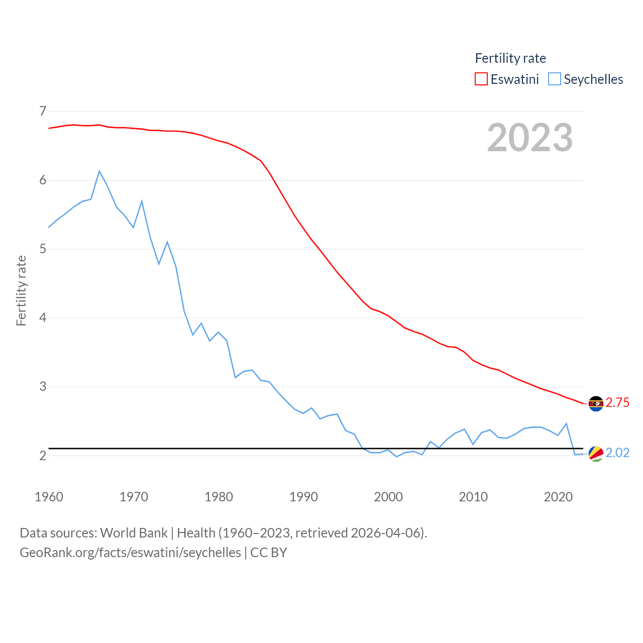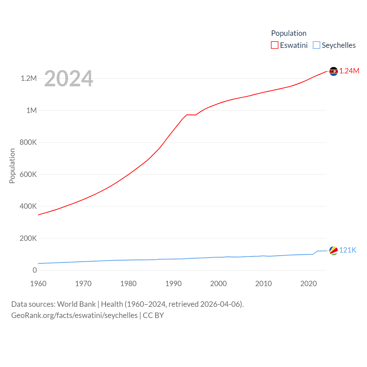 Eswatini has a population of 1.24M (ranked 157/197), compared with 121K in The Seychelles (ranked 181/197). Eswatini's land area is 6,641 sq mi versus 177.6 sq mi for The Seychelles (ranked 154th vs. 181st).
