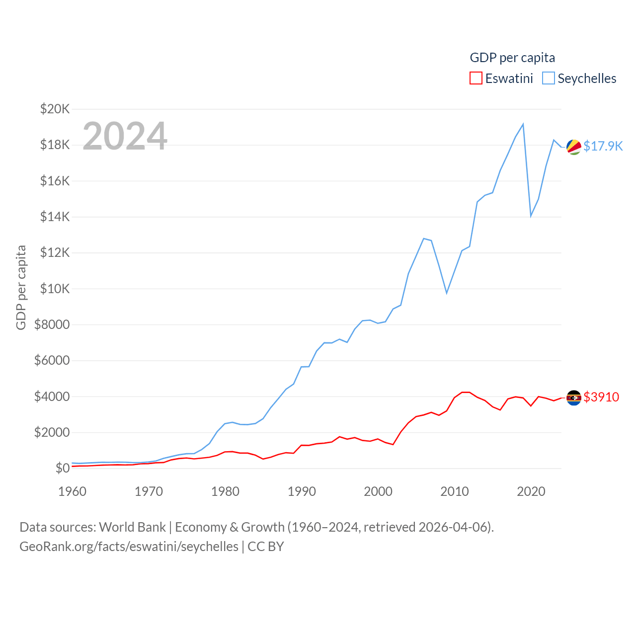 By GDP, Eswatini ranks 162/197 ($4.86B) and The Seychelles ranks 178/197 ($2.17B). By GDP per capita, Eswatini ranks 131/197 ($3,910), while The Seychelles ranks 63/197 ($17,859).