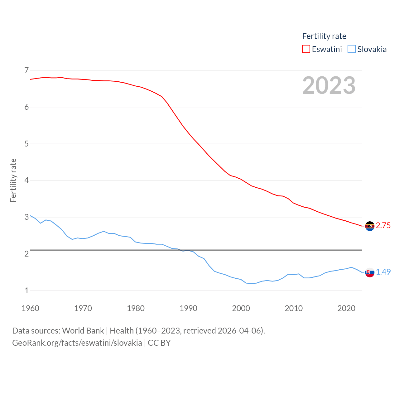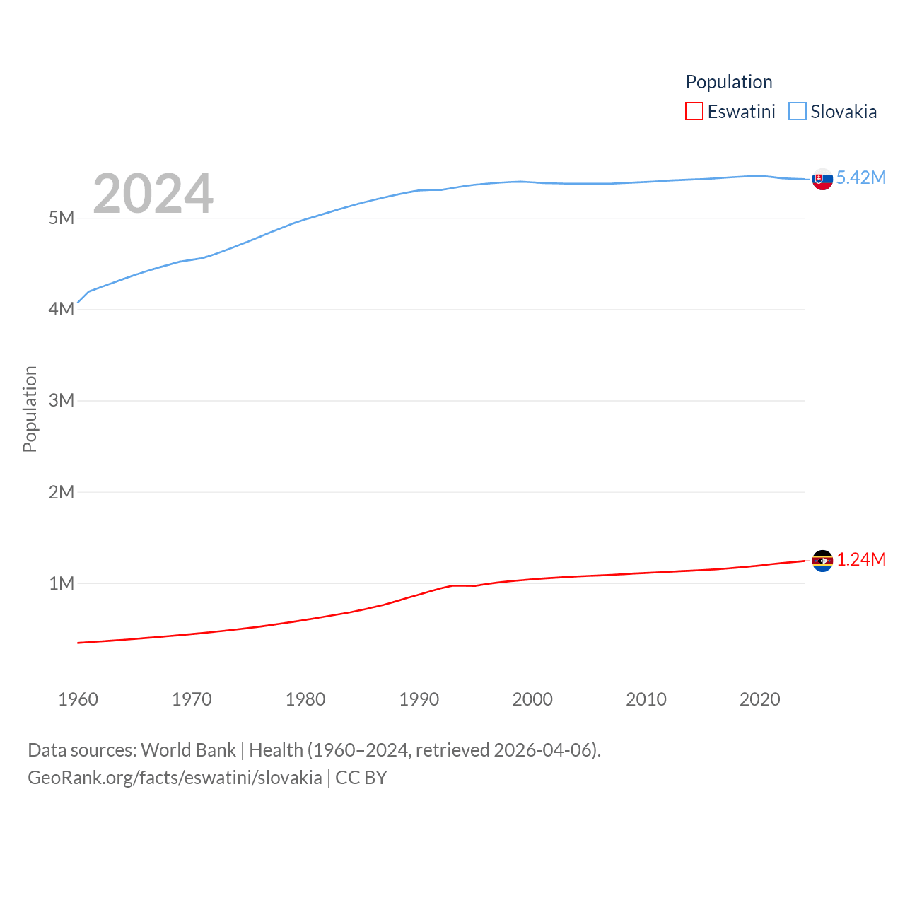 Eswatini has a population of 1.24M (ranked 157/197), compared with 5.42M in Slovakia (ranked 119/197). Eswatini's land area is 6,641 sq mi versus 18,564 sq mi for Slovakia (ranked 154th vs. 128th).