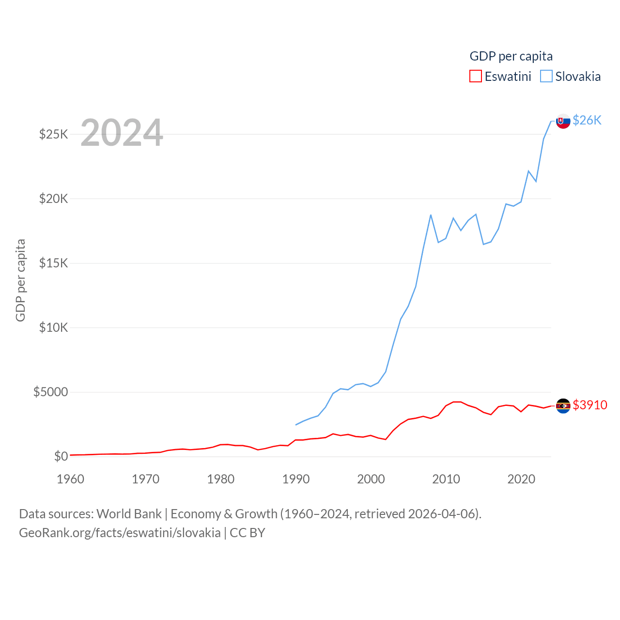 By GDP, Eswatini ranks 162/197 ($4.86B) and Slovakia ranks 61/197 ($141B). By GDP per capita, Eswatini ranks 131/197 ($3,910), while Slovakia ranks 47/197 ($25,993).