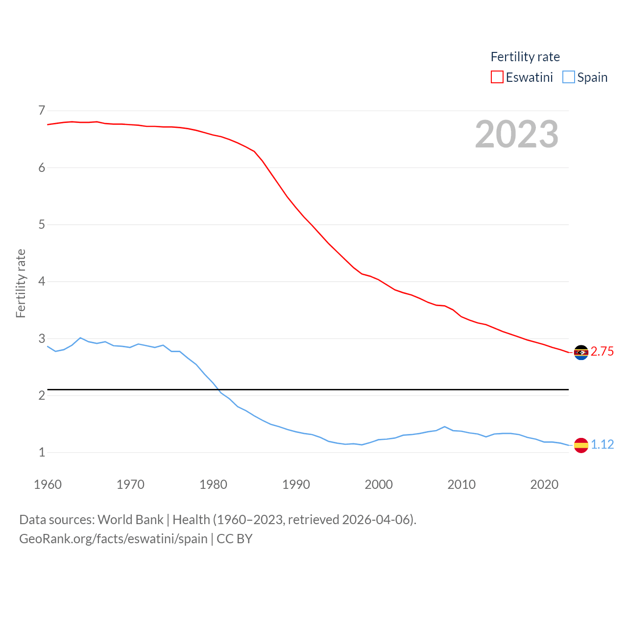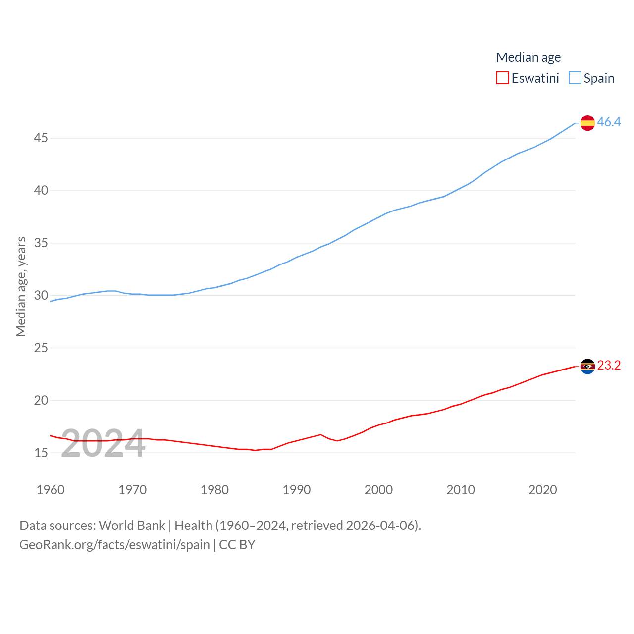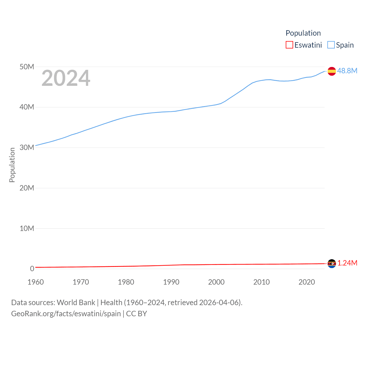 Eswatini has a population of 1.24M (ranked 157/197), compared with 48.8M in Spain (ranked 32/197). Eswatini's land area is 6,641 sq mi versus 192,934 sq mi for Spain (ranked 154th vs. 51st).
