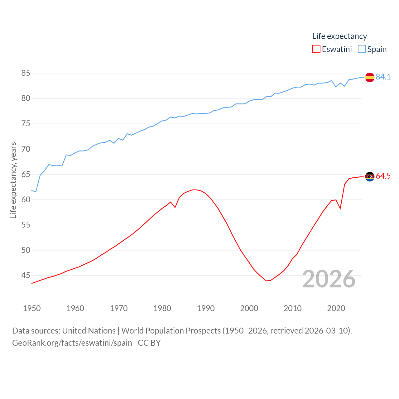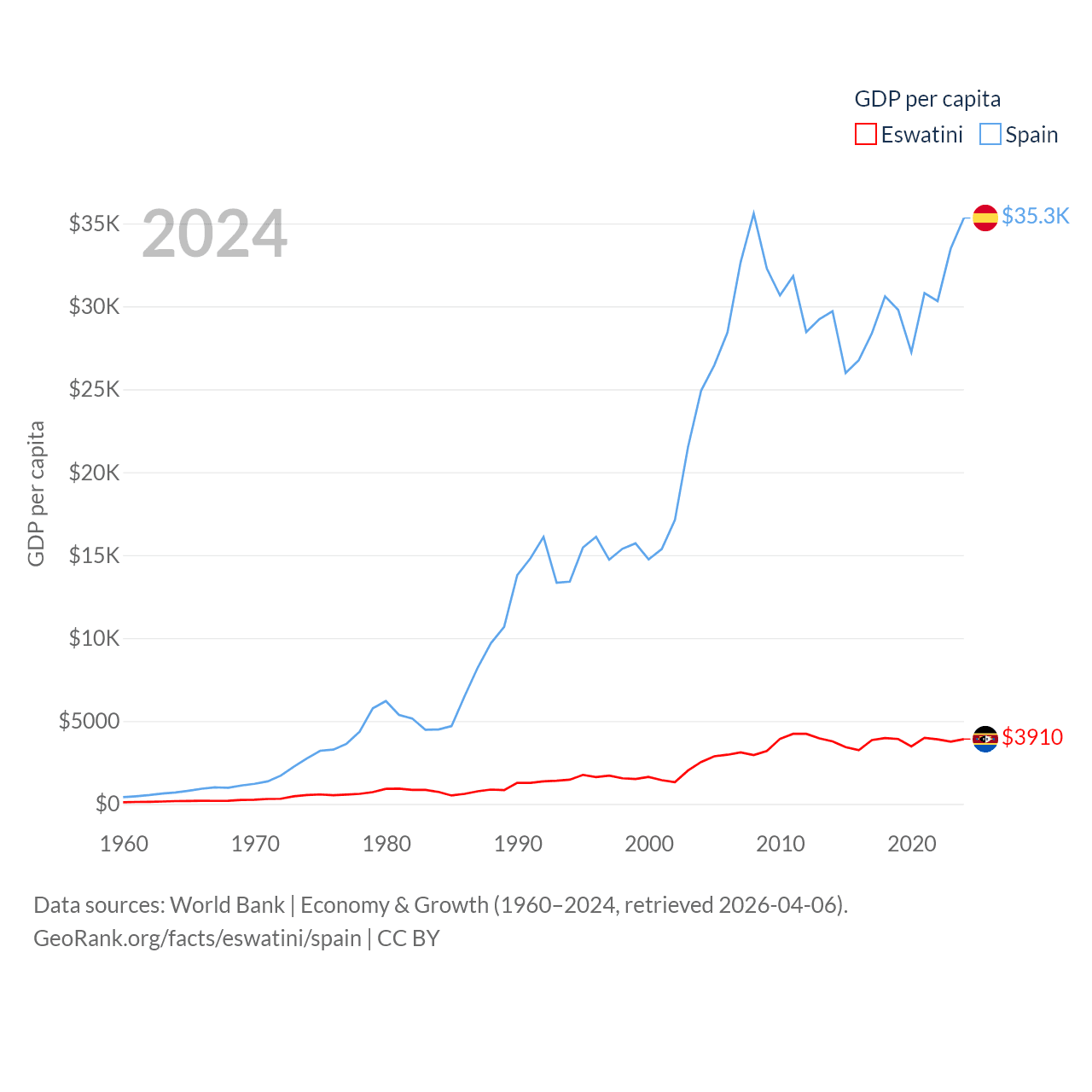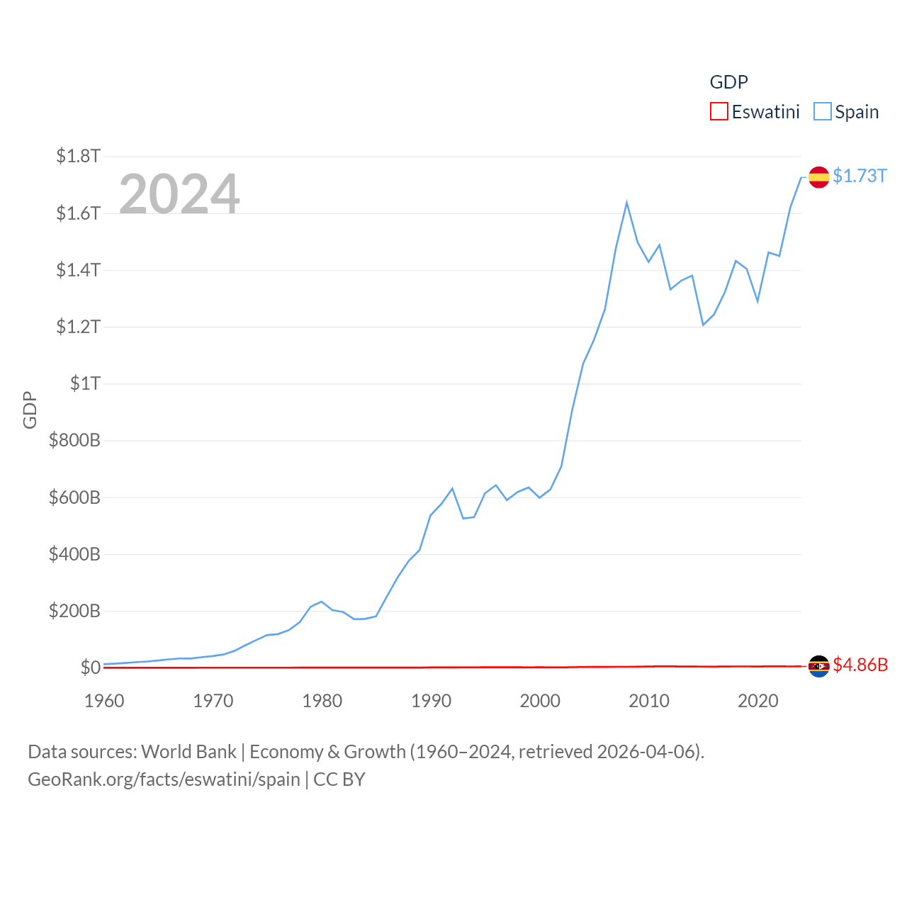 By GDP, Eswatini ranks 162/197 ($4.86B) and Spain ranks 15/197 ($1.73T). By GDP per capita, Eswatini ranks 131/197 ($3,910), while Spain ranks 32/197 ($35,327).