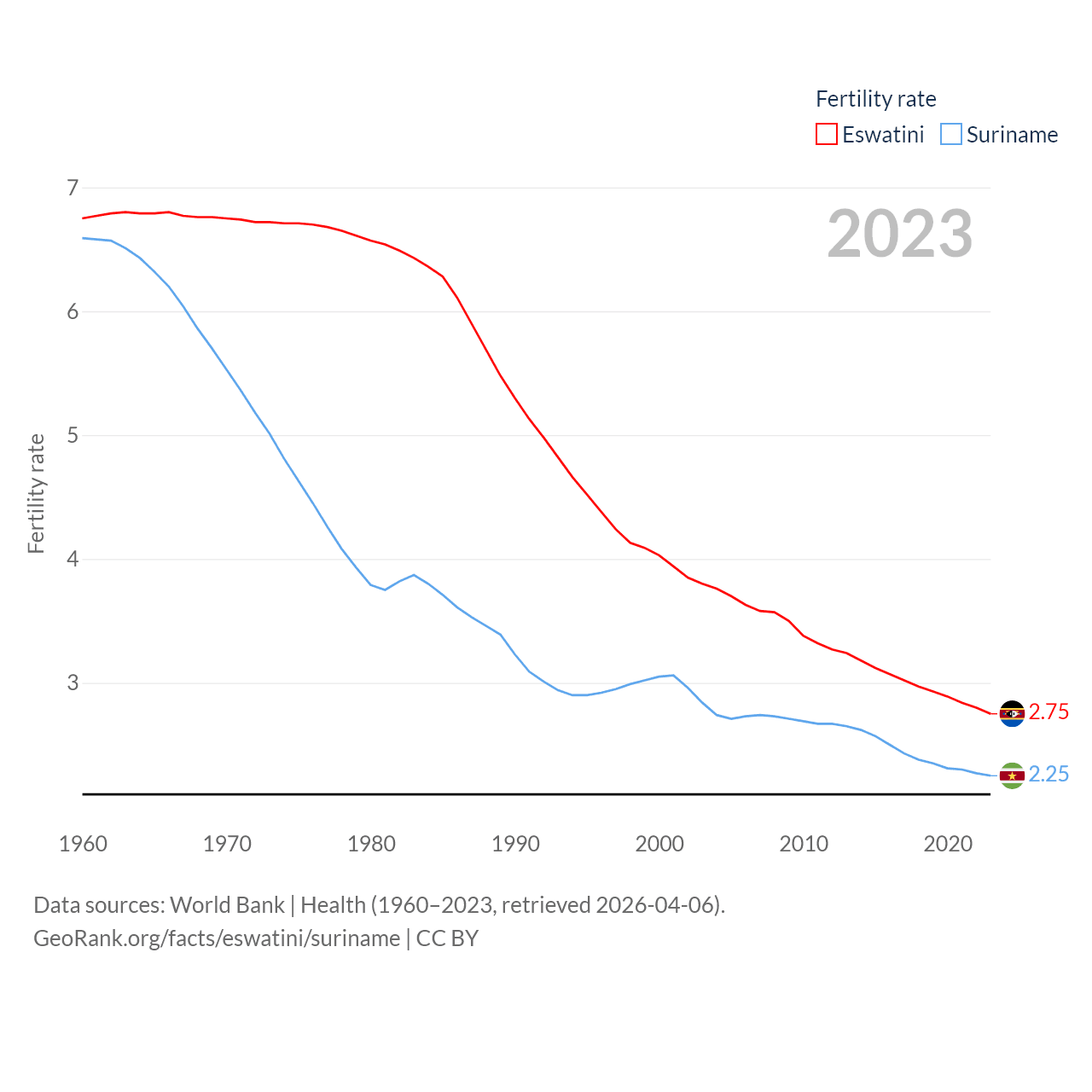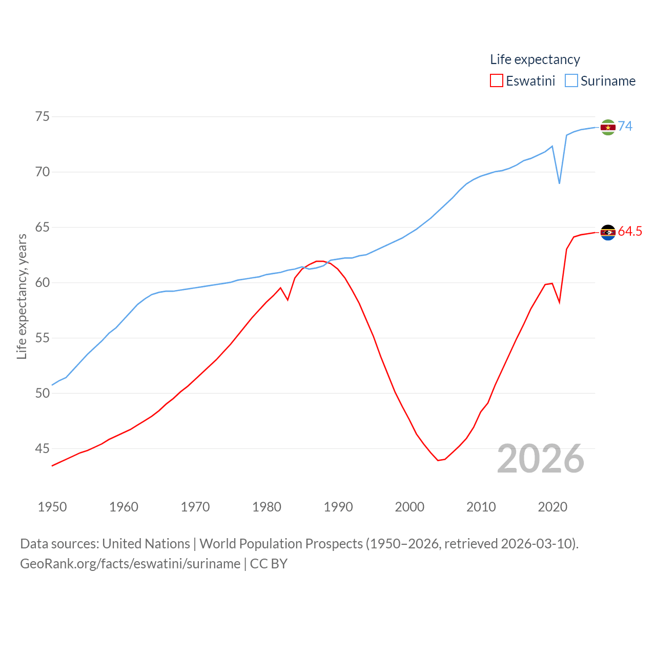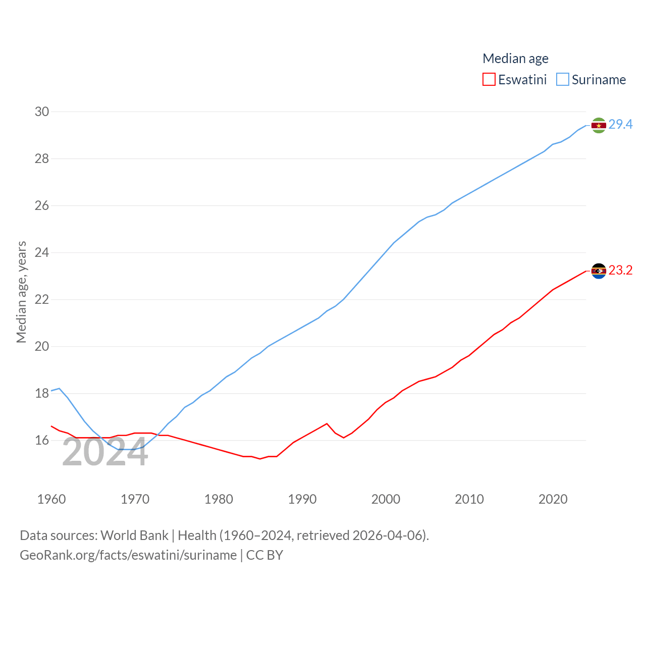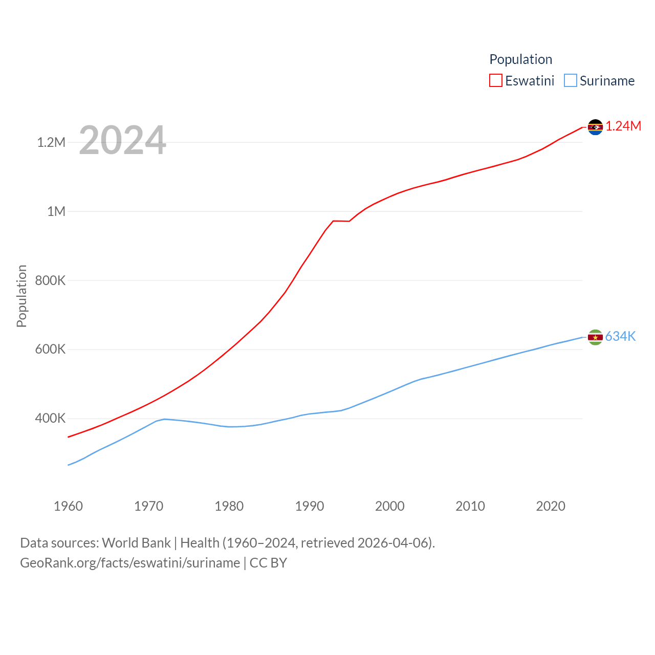 Eswatini has a population of 1.24M (ranked 157/197), compared with 634K in Suriname (ranked 165/197). Eswatini's land area is 6,641 sq mi versus 61,972 sq mi for Suriname (ranked 154th vs. 90th).