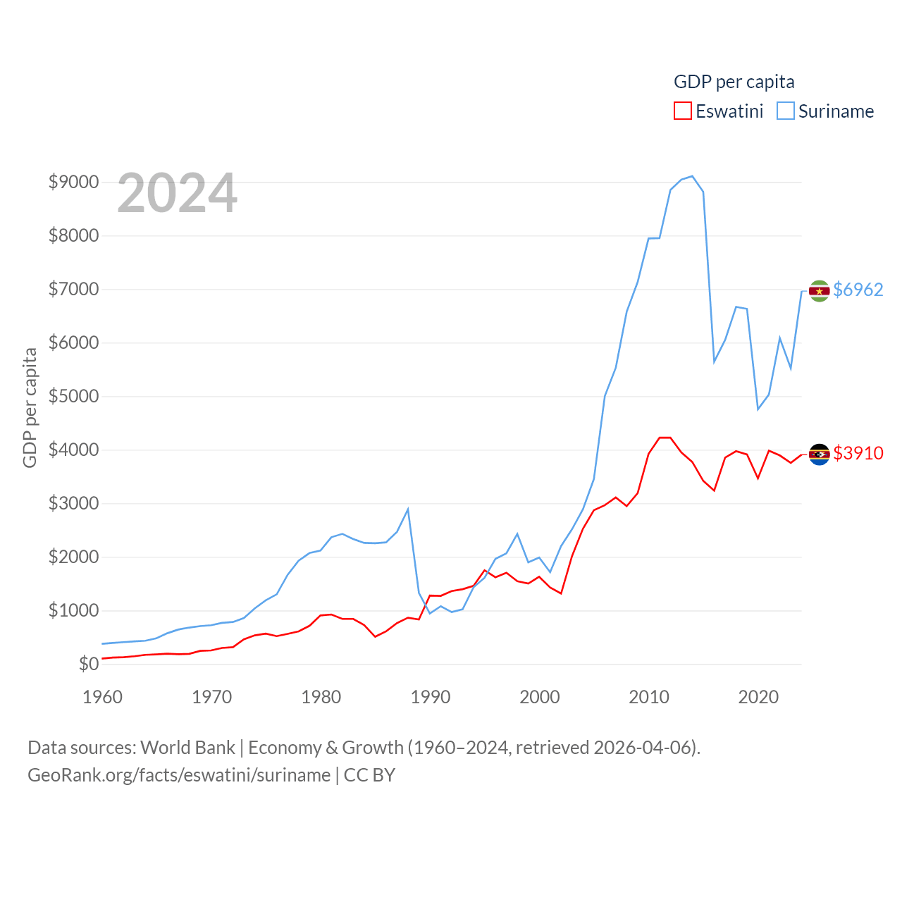 By GDP, Eswatini ranks 162/197 ($4.86B) and Suriname ranks 164/197 ($4.42B). By GDP per capita, Eswatini ranks 131/197 ($3,910), while Suriname ranks 102/197 ($6,962).