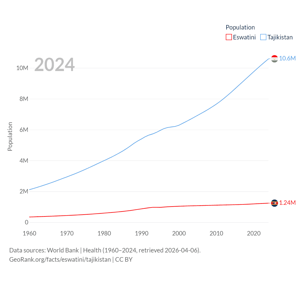 Eswatini has a population of 1.24M (ranked 157/197), compared with 10.6M in Tajikistan (ranked 91/197). Eswatini's land area is 6,641 sq mi versus 53,587 sq mi for Tajikistan (ranked 154th vs. 93rd).