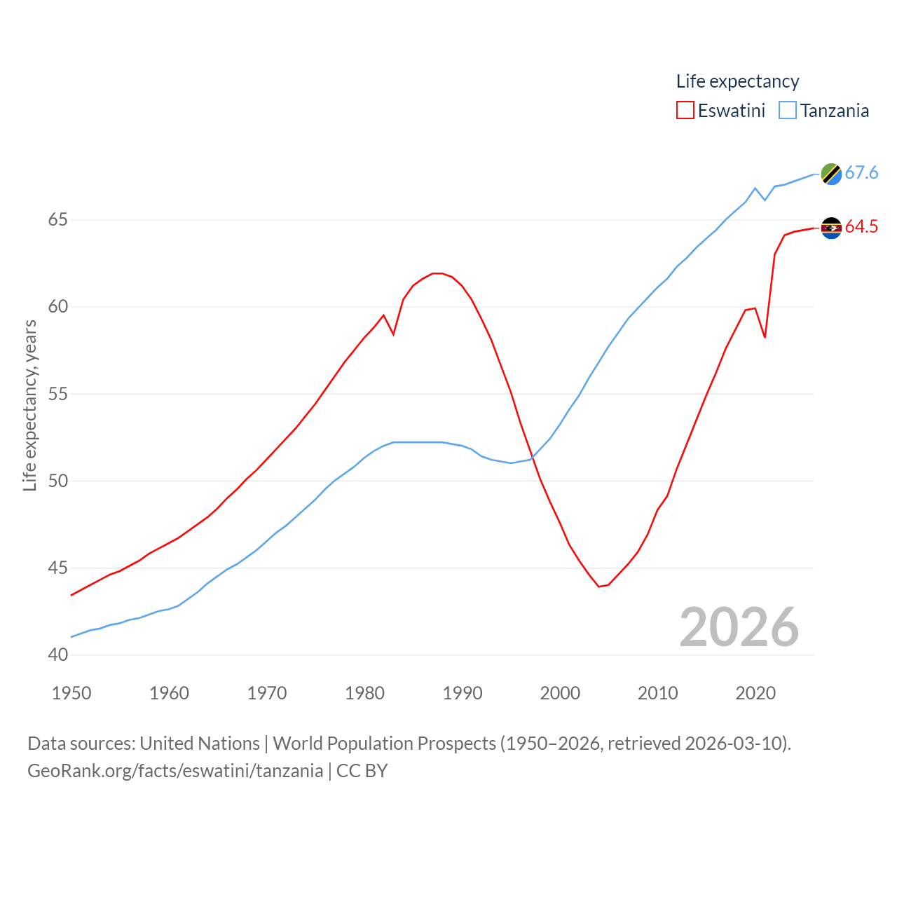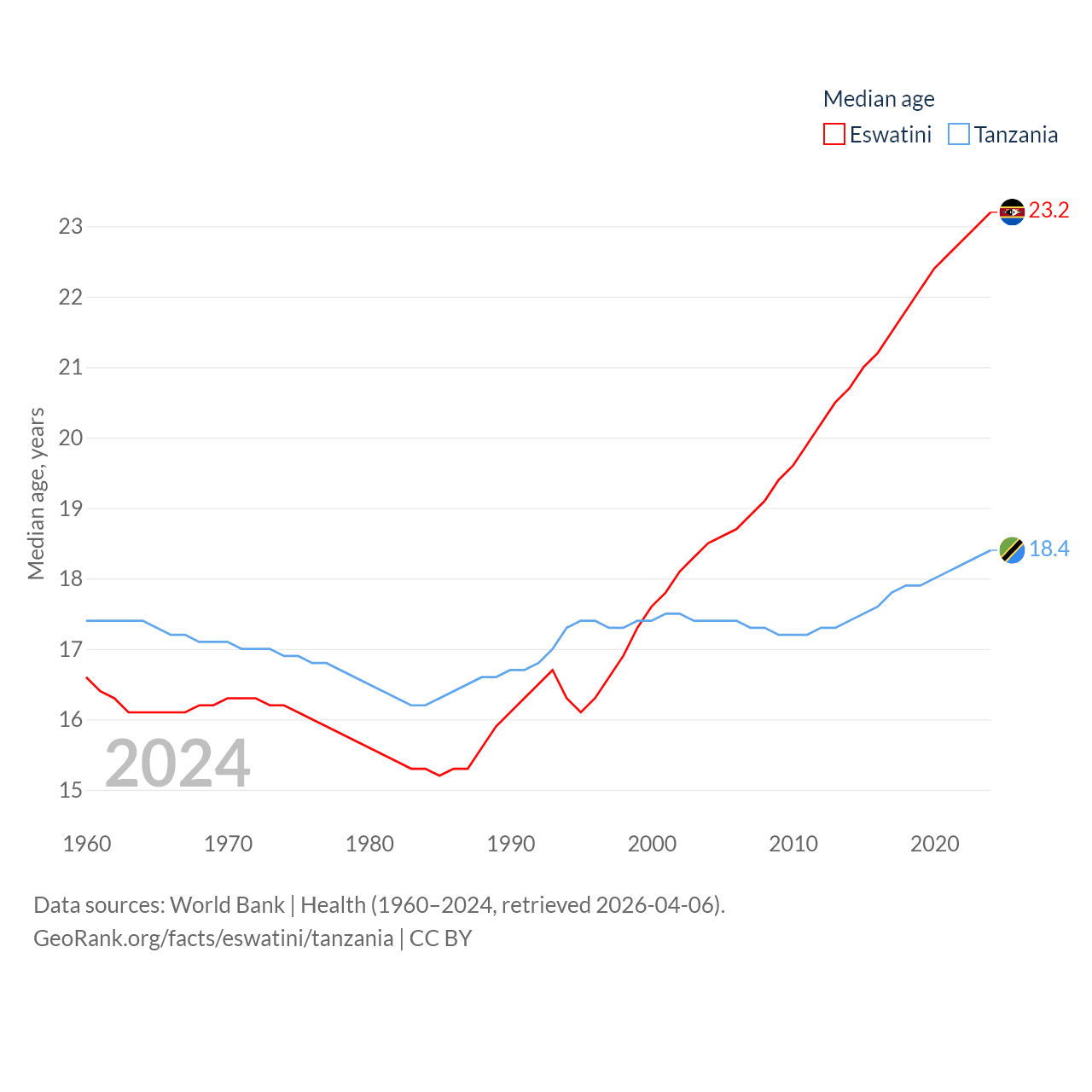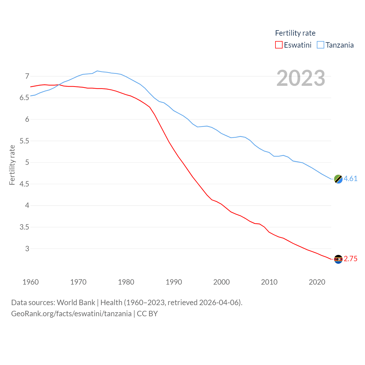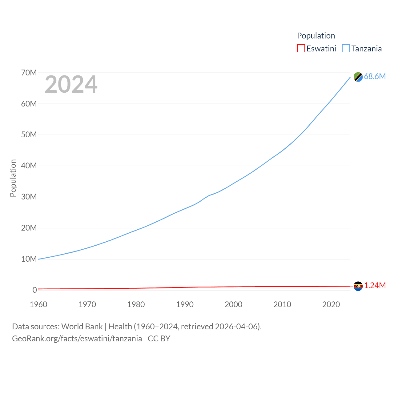 Eswatini has a population of 1.24M (ranked 157/197), compared with 68.6M in Tanzania (ranked 22/197). Eswatini's land area is 6,641 sq mi versus 342,009 sq mi for Tanzania (ranked 154th vs. 31st).