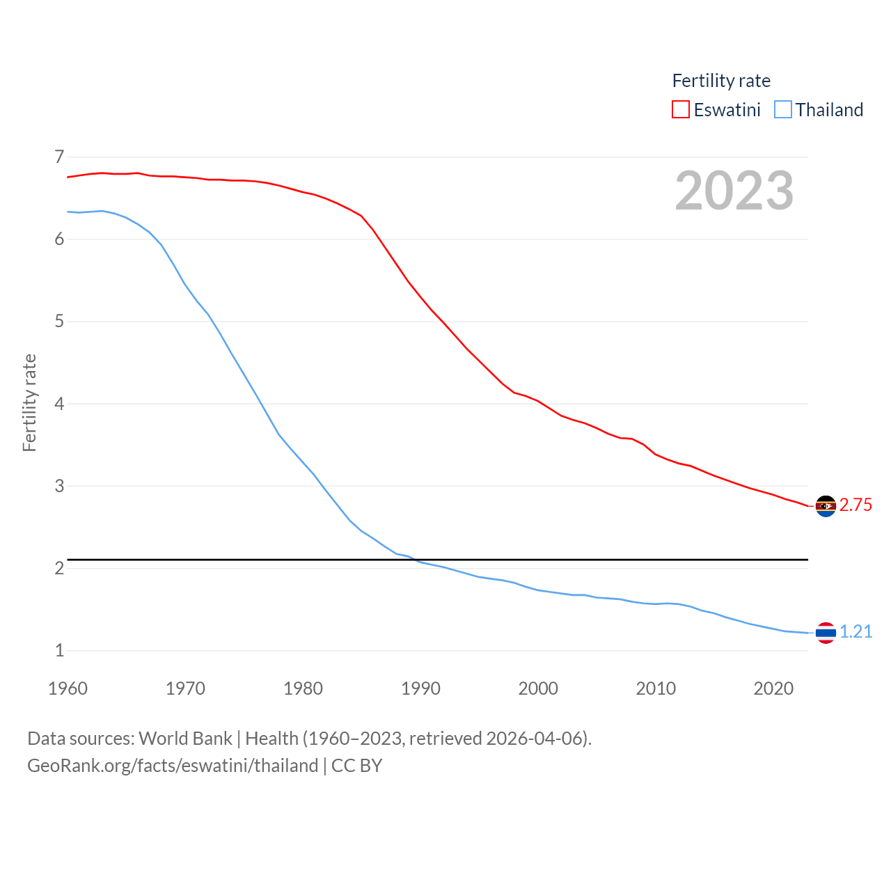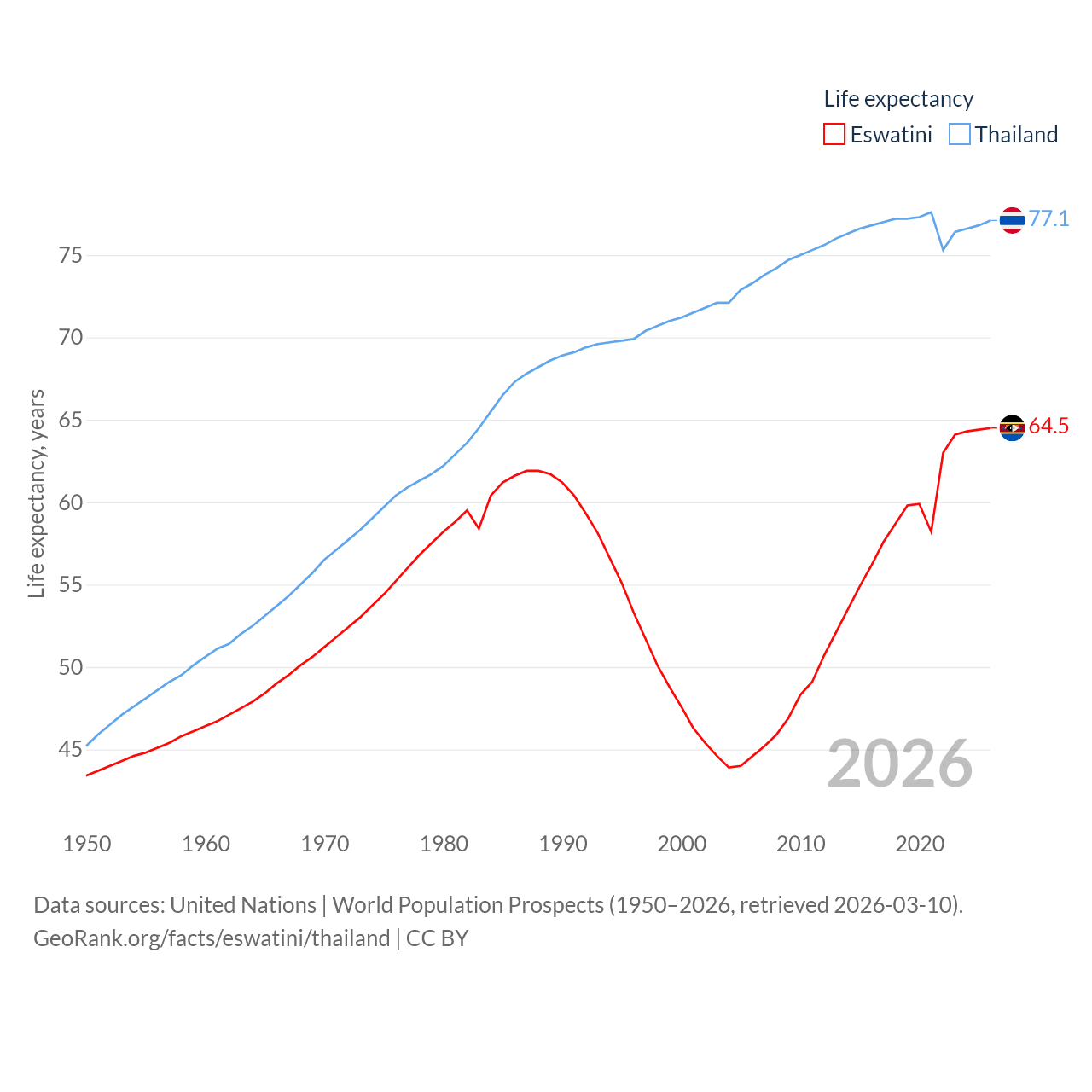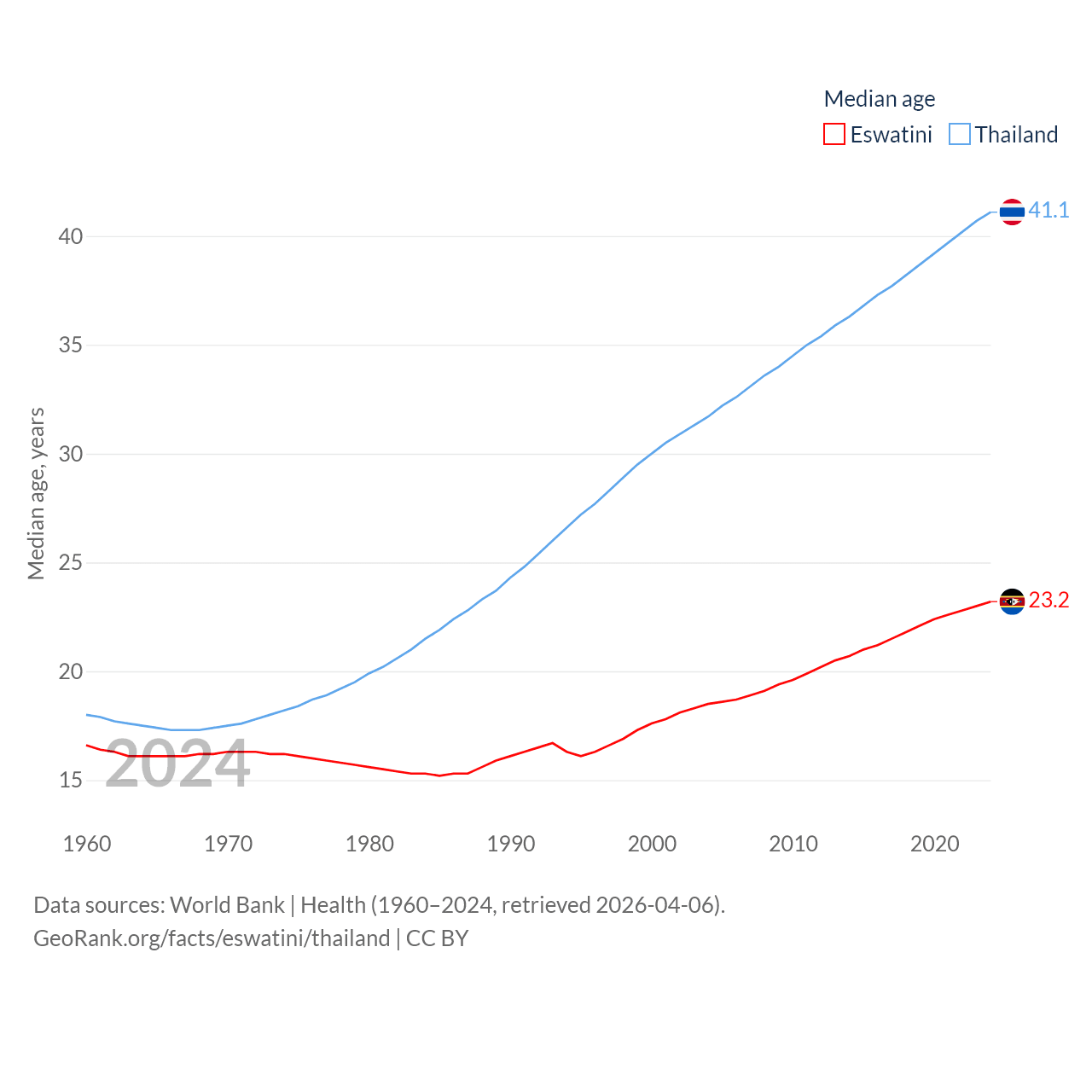 Eswatini has a population of 1.24M (ranked 157/197), compared with 71.7M in Thailand (ranked 20/197). Eswatini's land area is 6,641 sq mi versus 197,256 sq mi for Thailand (ranked 154th vs. 50th).