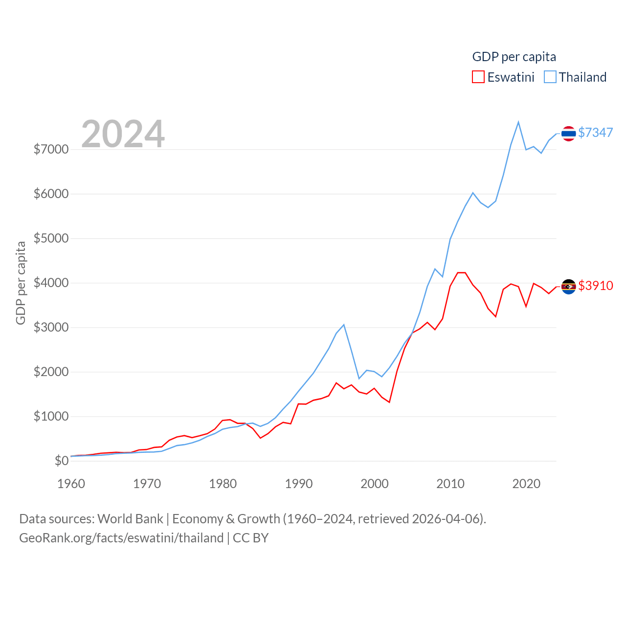 By GDP, Eswatini ranks 162/197 ($4.86B) and Thailand ranks 31/197 ($527B). By GDP per capita, Eswatini ranks 131/197 ($3,910), while Thailand ranks 100/197 ($7,347).