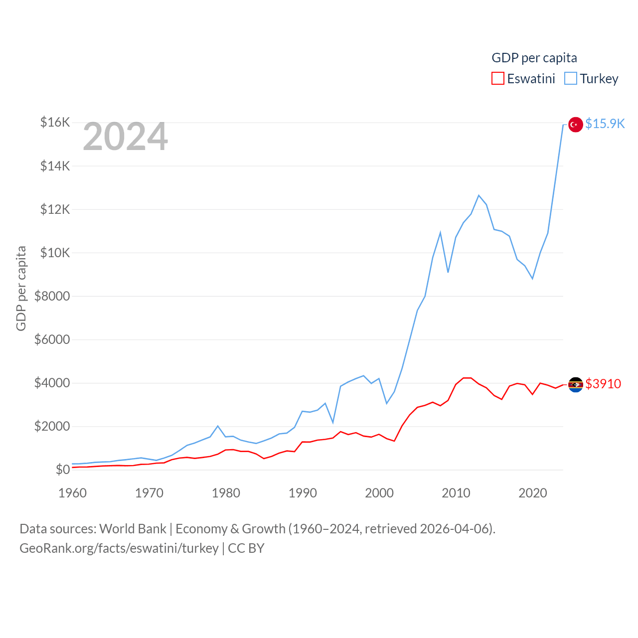 By GDP, Eswatini ranks 162/197 ($4.86B) and Turkey ranks 17/197 ($1.36T). By GDP per capita, Eswatini ranks 131/197 ($3,910), while Turkey ranks 66/197 ($15,893).