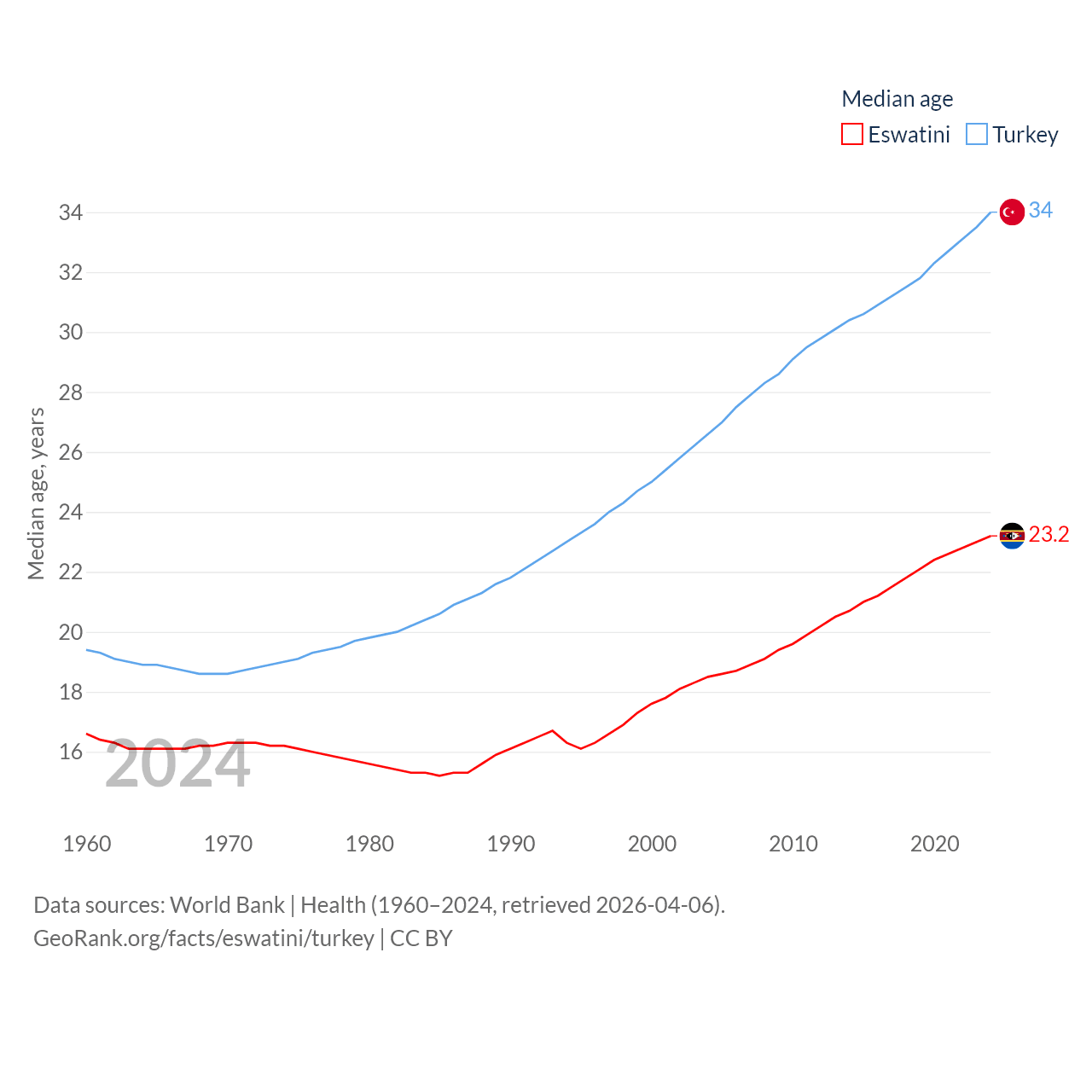 Eswatini has a population of 1.24M (ranked 157/197), compared with 85.5M in Turkey (ranked 18/197). Eswatini's land area is 6,641 sq mi versus 297,156 sq mi for Turkey (ranked 154th vs. 36th).