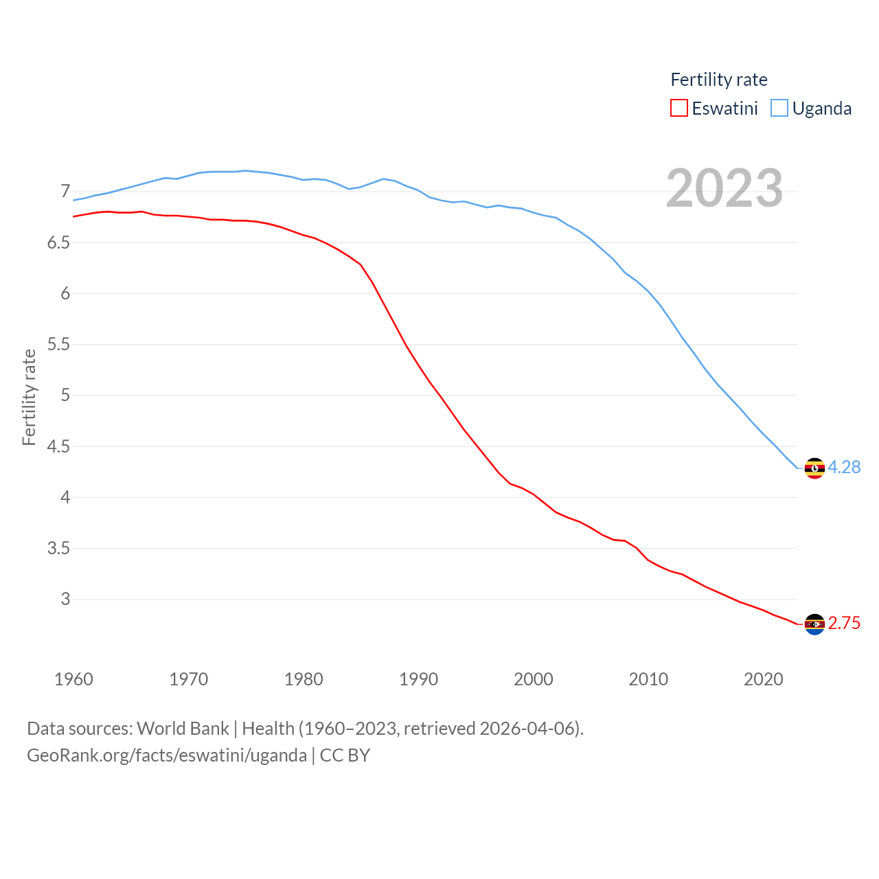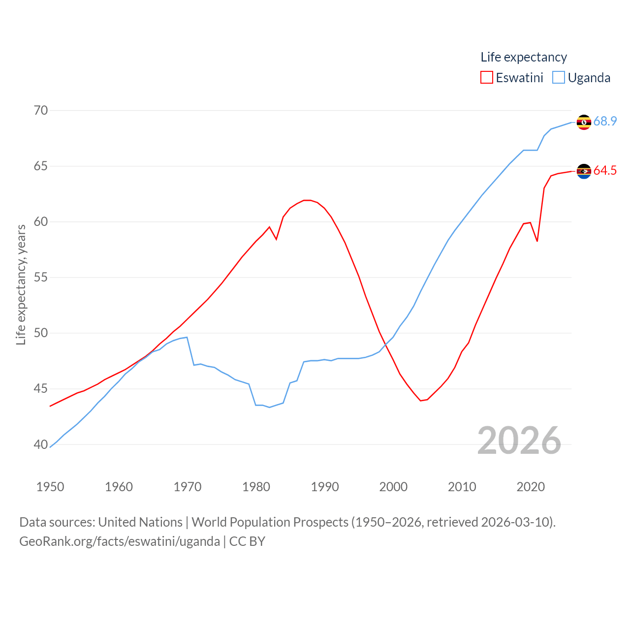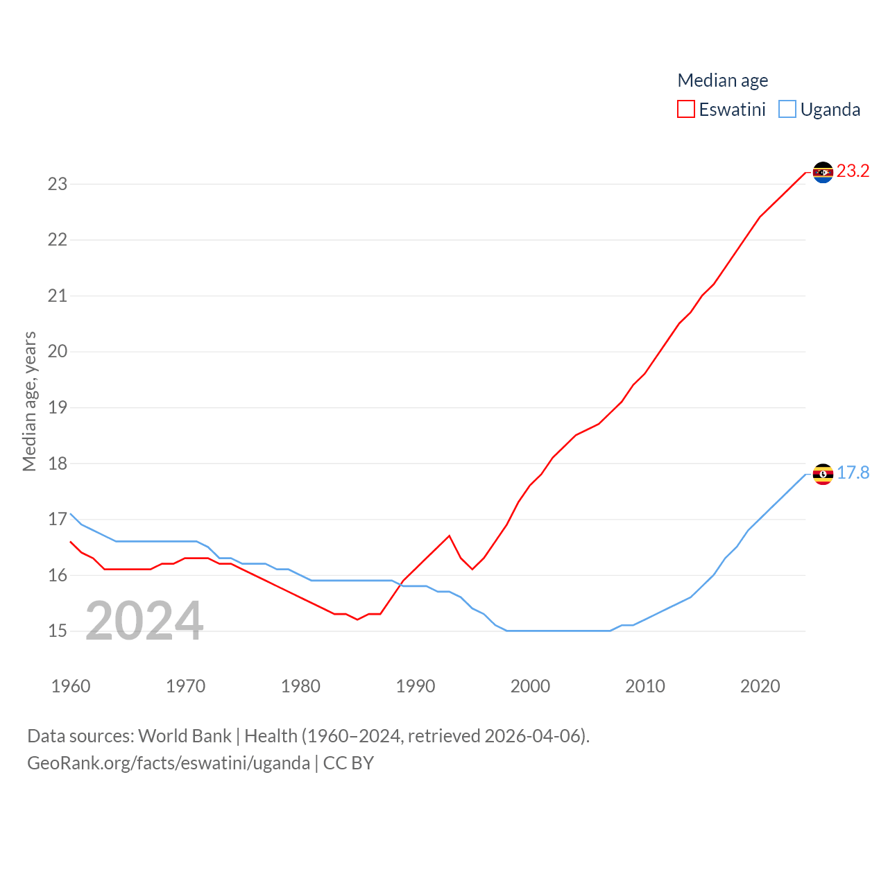 Eswatini has a population of 1.24M (ranked 157/197), compared with 50M in Uganda (ranked 31/197). Eswatini's land area is 6,641 sq mi versus 77,421 sq mi for Uganda (ranked 154th vs. 84th).
