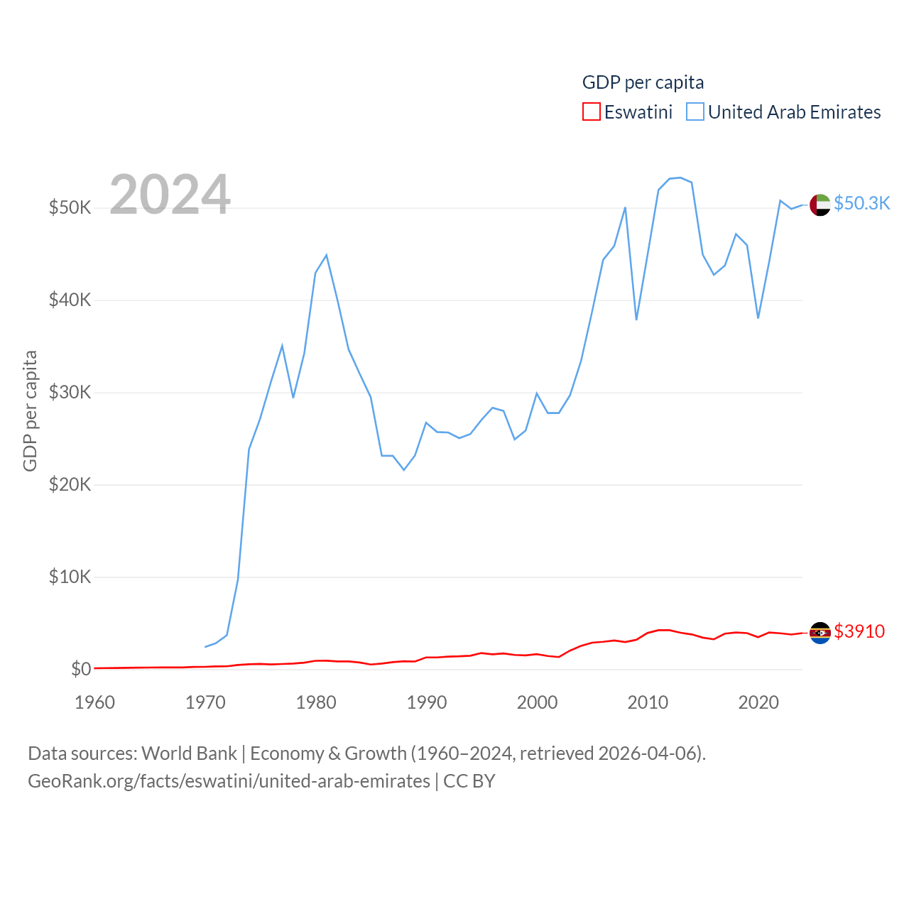 By GDP, Eswatini ranks 162/197 ($4.86B) and The United Arab Emirates ranks 27/197 ($552B). By GDP per capita, Eswatini ranks 131/197 ($3,910), while The United Arab Emirates ranks 24/197 ($50,274).