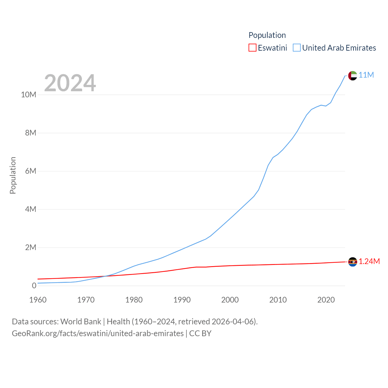 Eswatini has a population of 1.24M (ranked 157/197), compared with 11M in The United Arab Emirates (ranked 86/197). Eswatini's land area is 6,641 sq mi versus 27,421 sq mi for The United Arab Emirates (ranked 154th vs. 117th).