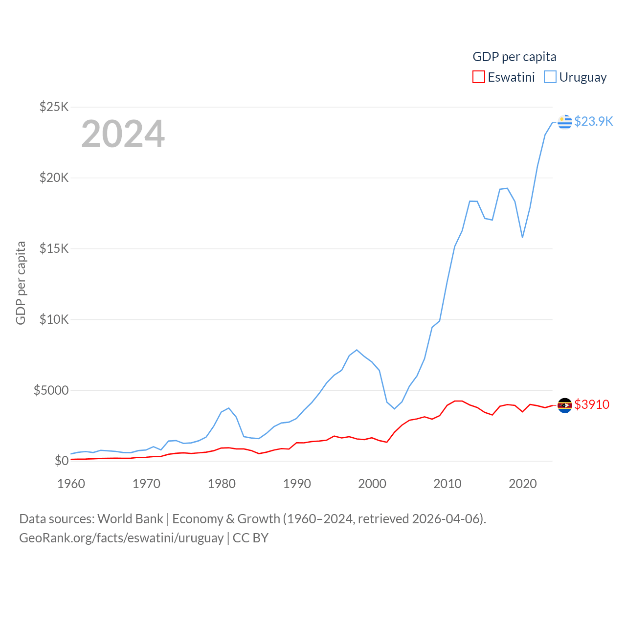 By GDP, Eswatini ranks 162/197 ($4.86B) and Uruguay ranks 81/197 ($81B). By GDP per capita, Eswatini ranks 131/197 ($3,910), while Uruguay ranks 52/197 ($23,907).