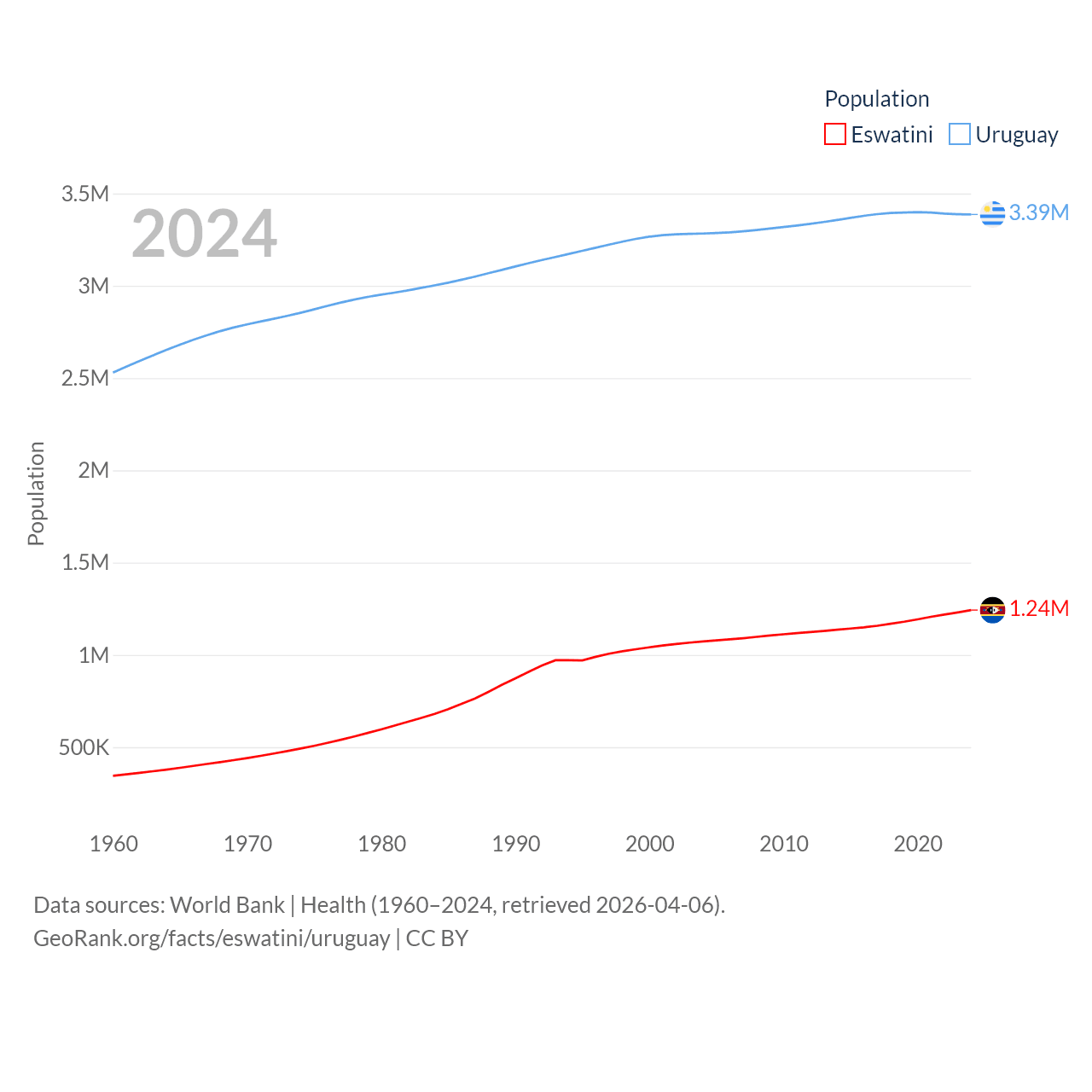 Eswatini has a population of 1.24M (ranked 157/197), compared with 3.39M in Uruguay (ranked 133/197). Eswatini's land area is 6,641 sq mi versus 67,576 sq mi for Uruguay (ranked 154th vs. 89th).