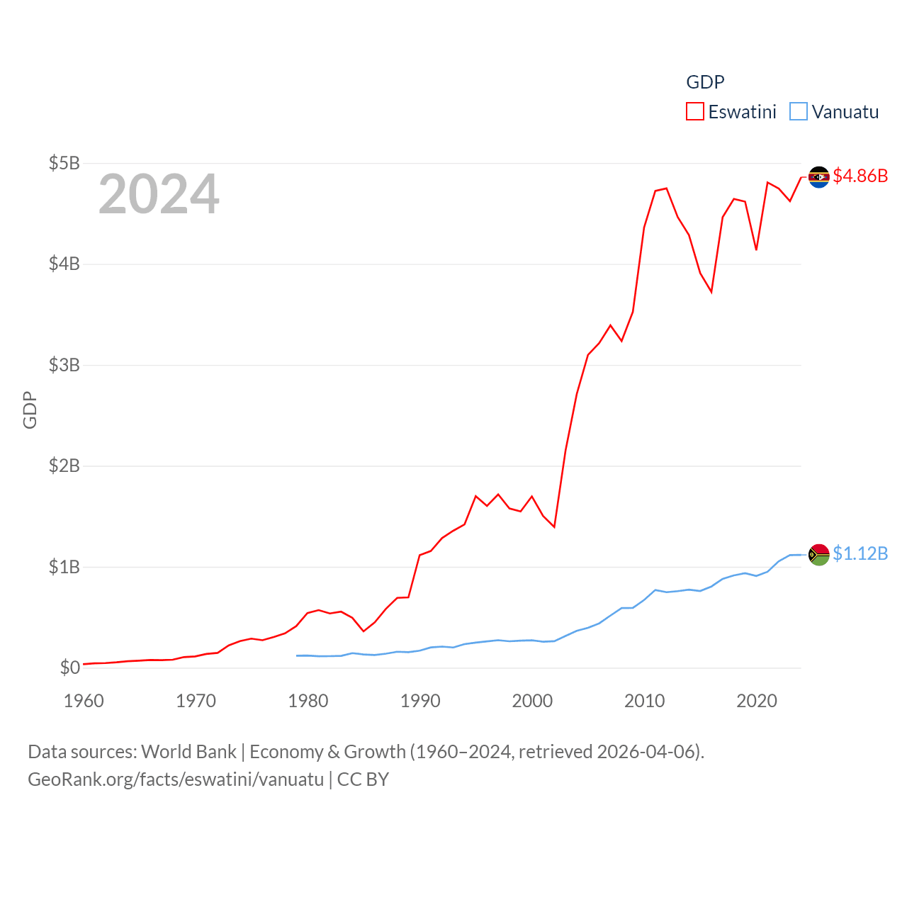 By GDP, Eswatini ranks 162/197 ($4.86B) and Vanuatu ranks 188/197 ($1.12B). By GDP per capita, Eswatini ranks 131/197 ($3,910), while Vanuatu ranks 137/197 ($3,411).