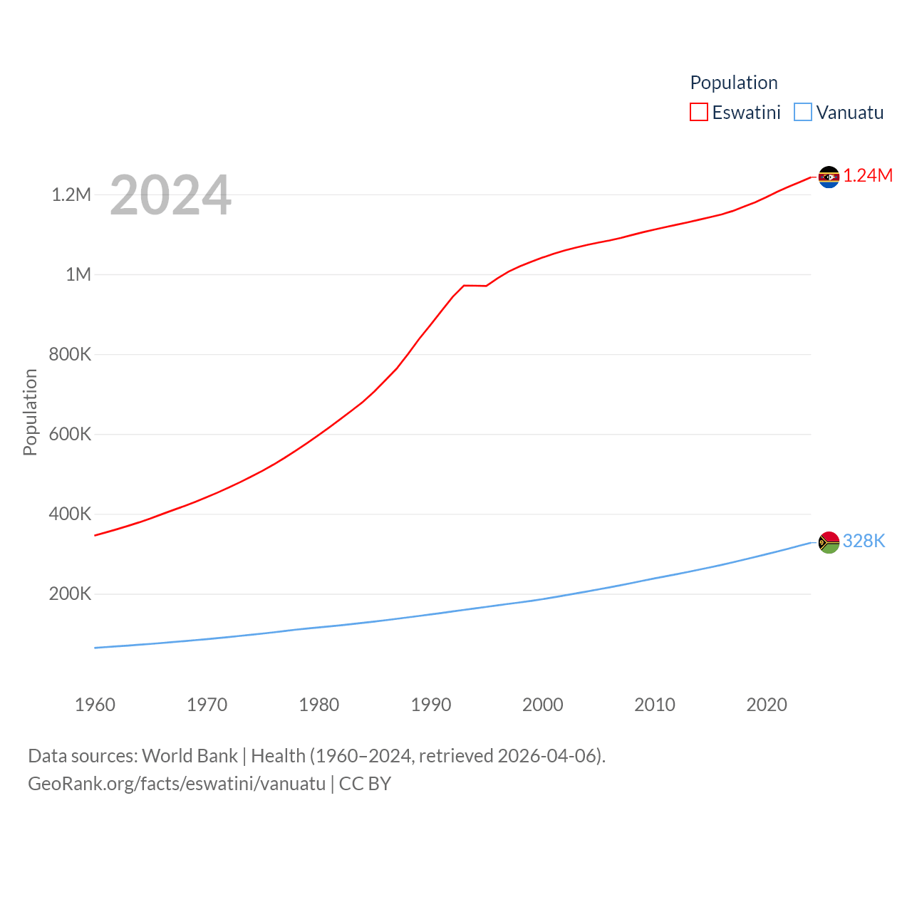 Eswatini has a population of 1.24M (ranked 157/197), compared with 328K in Vanuatu (ranked 174/197). Eswatini's land area is 6,641 sq mi versus 4,707 sq mi for Vanuatu (ranked 154th vs. 157th).