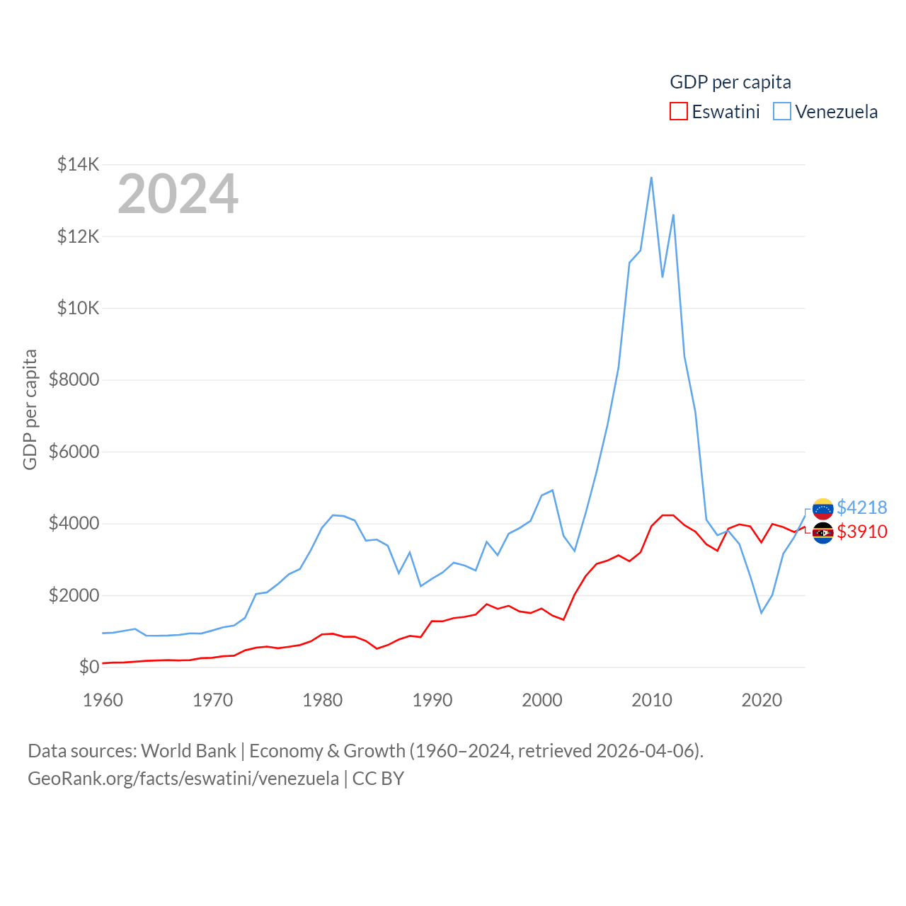 By GDP, Eswatini ranks 162/197 ($4.86B) and Venezuela ranks 65/197 ($120B). By GDP per capita, Eswatini ranks 131/197 ($3,910), while Venezuela ranks 128/197 ($4,218).